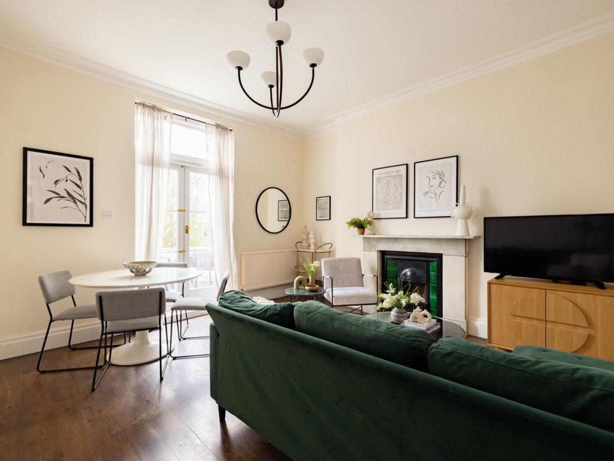 The reception room is bright and welcoming, featuring a velvet green sofa, smart TV, and a decorative fireplace. A round dining table comfortably seats four beside tall windows.