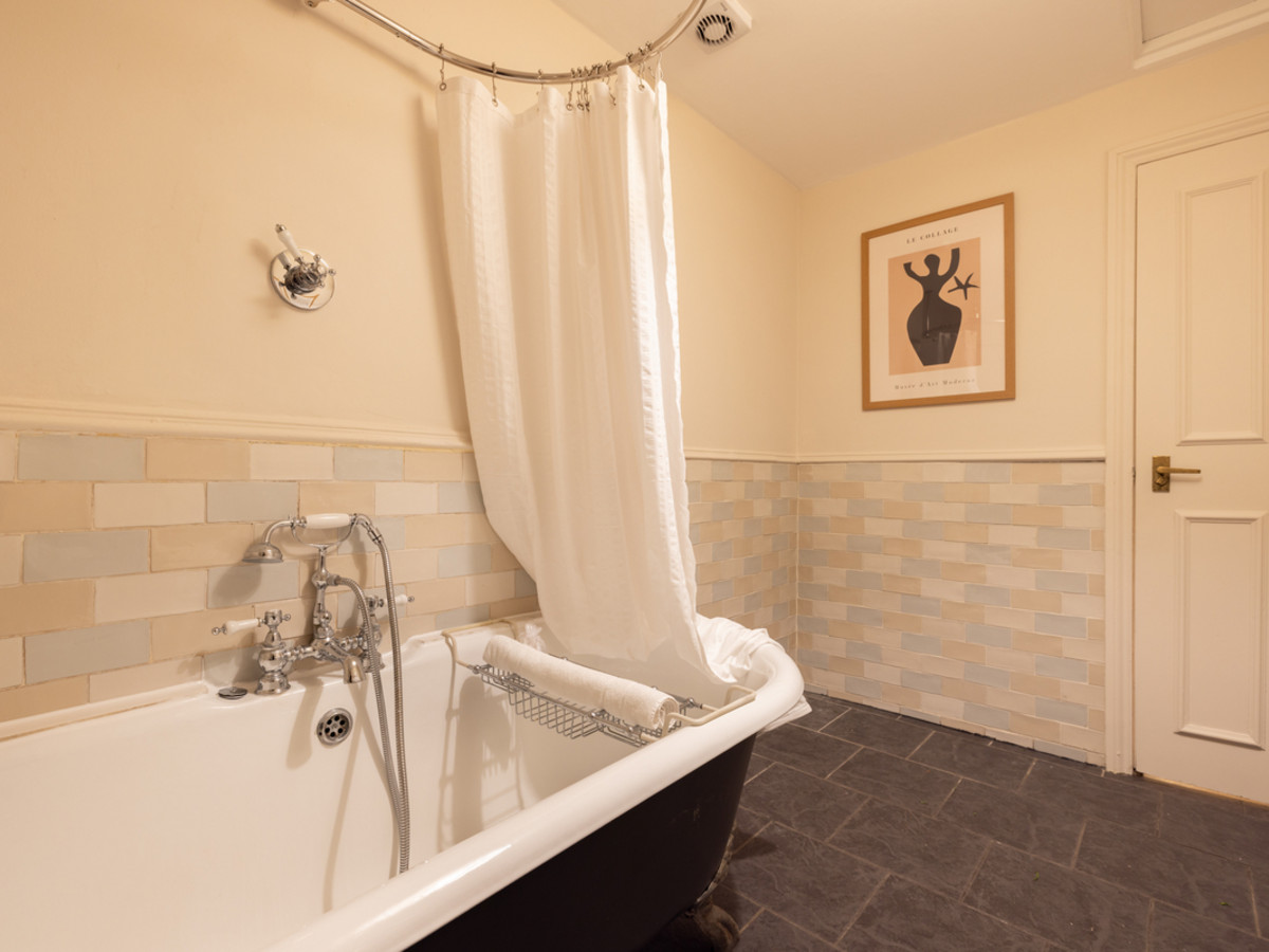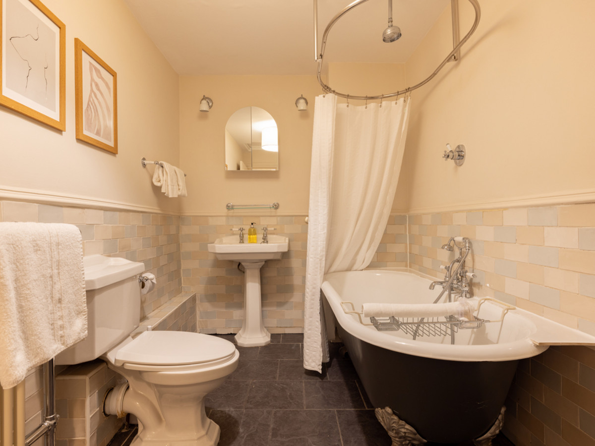 A traditional bathroom with elegant tilework, a freestanding tub and overhead shower. Finished with vintage-inspired fittings and warm lighting.