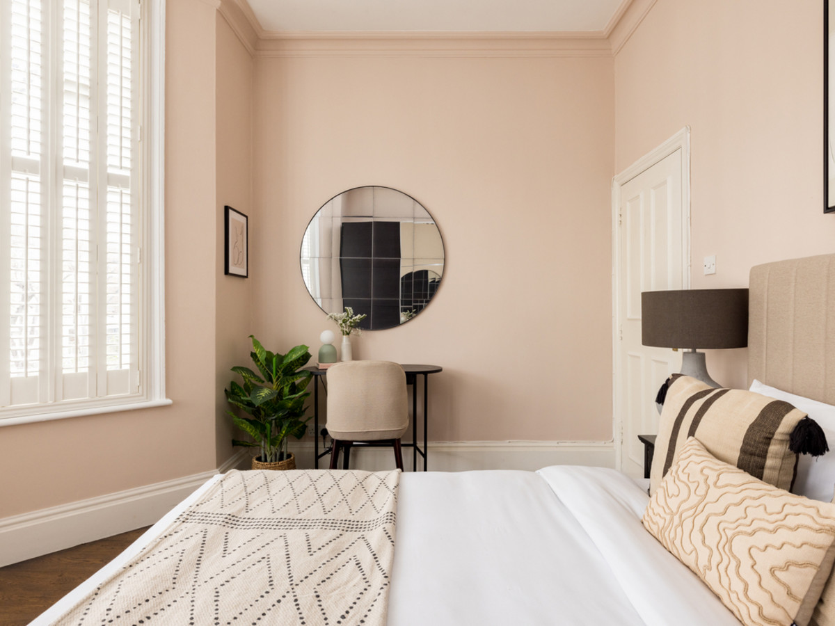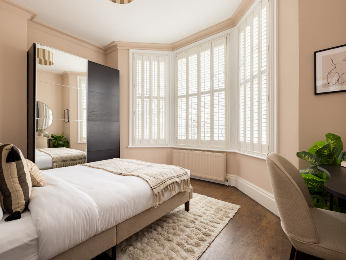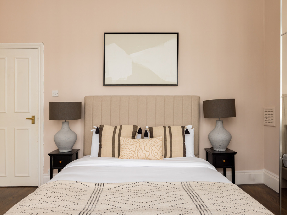 Two thoughtfully designed bedrooms, each with soft, neutral tones. The main bedrooms feature large sash windows and king bed, while the second bedroom features a double bed.