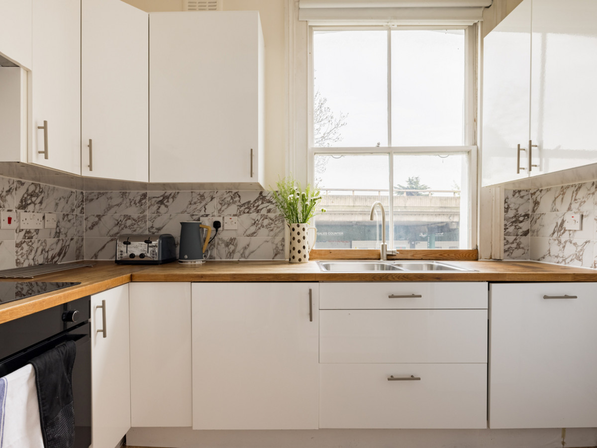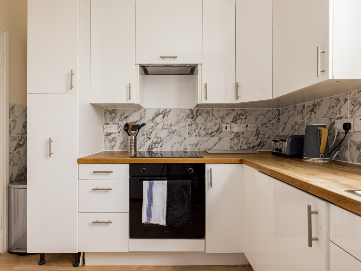 The separate kitchen includes marble-effect splashbacks, wooden worktops, and all the essentials for preparing meals at home, from morning coffee to relaxed dinners.