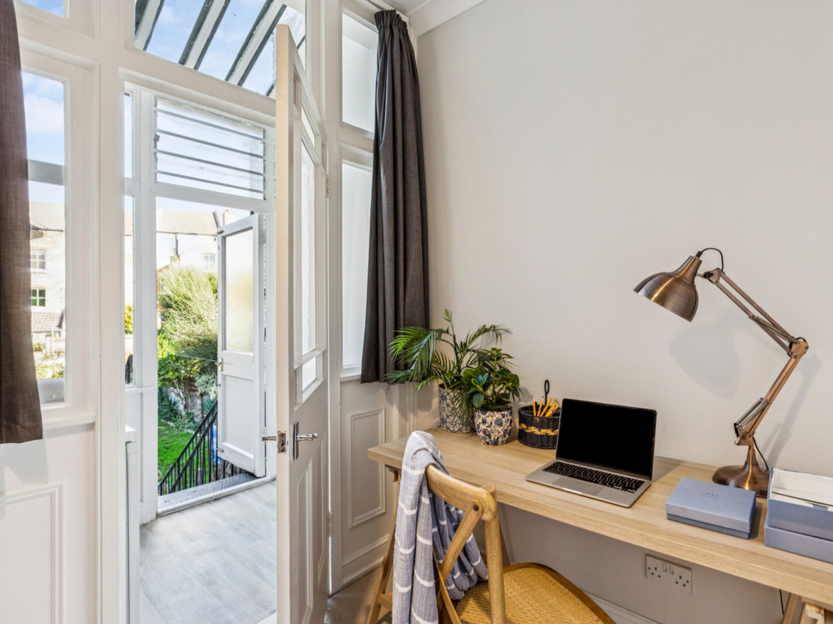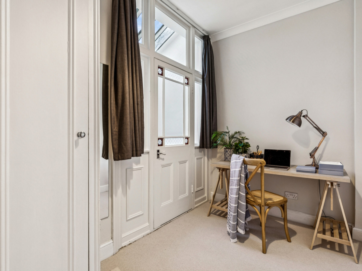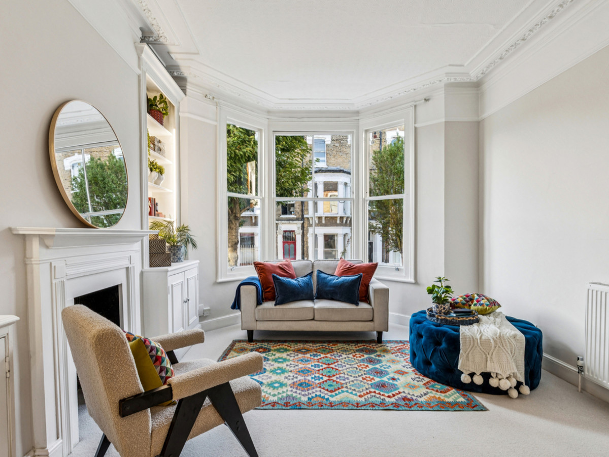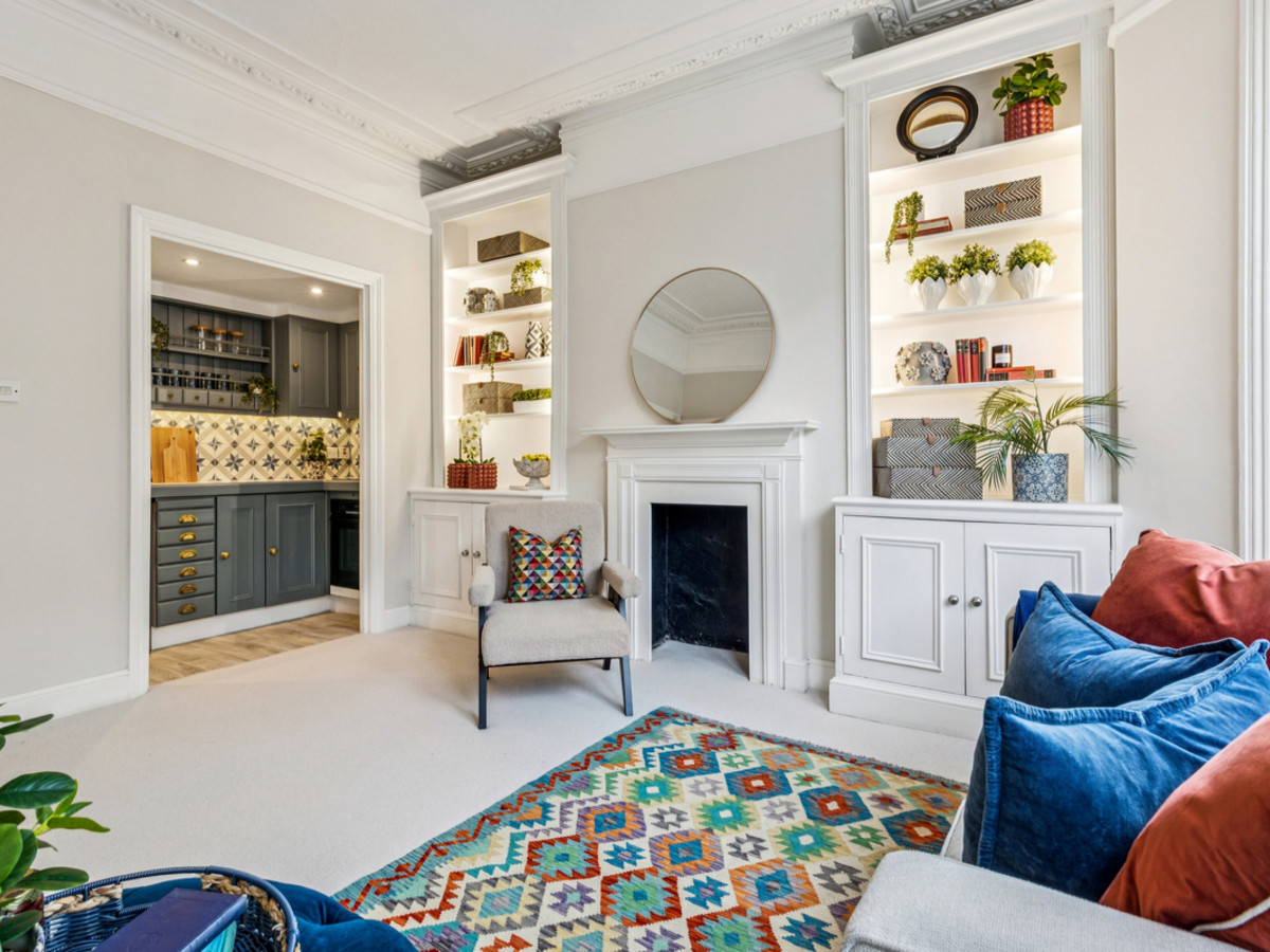 The elegant living room is a true highlight, featuring original cornicing, a beautiful fireplace, high ceilings, bespoke built-in shelving, and a large bay window. Thanks to its raised ground floor position and south-west facing aspect, the room is flooded with natural light throughout the day.