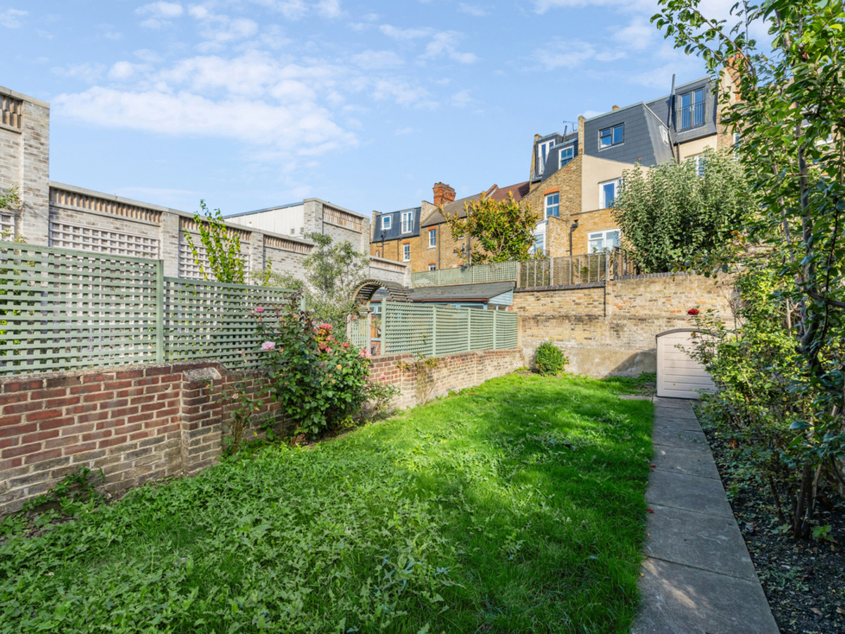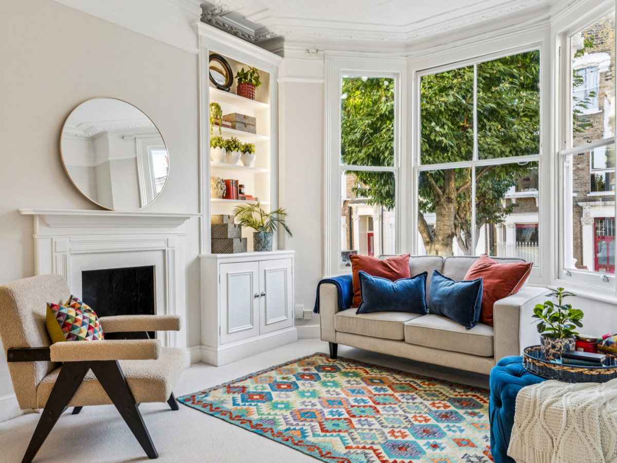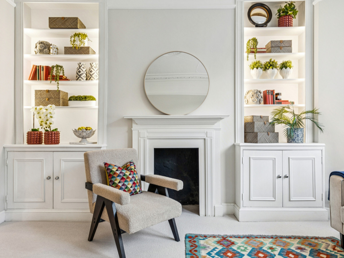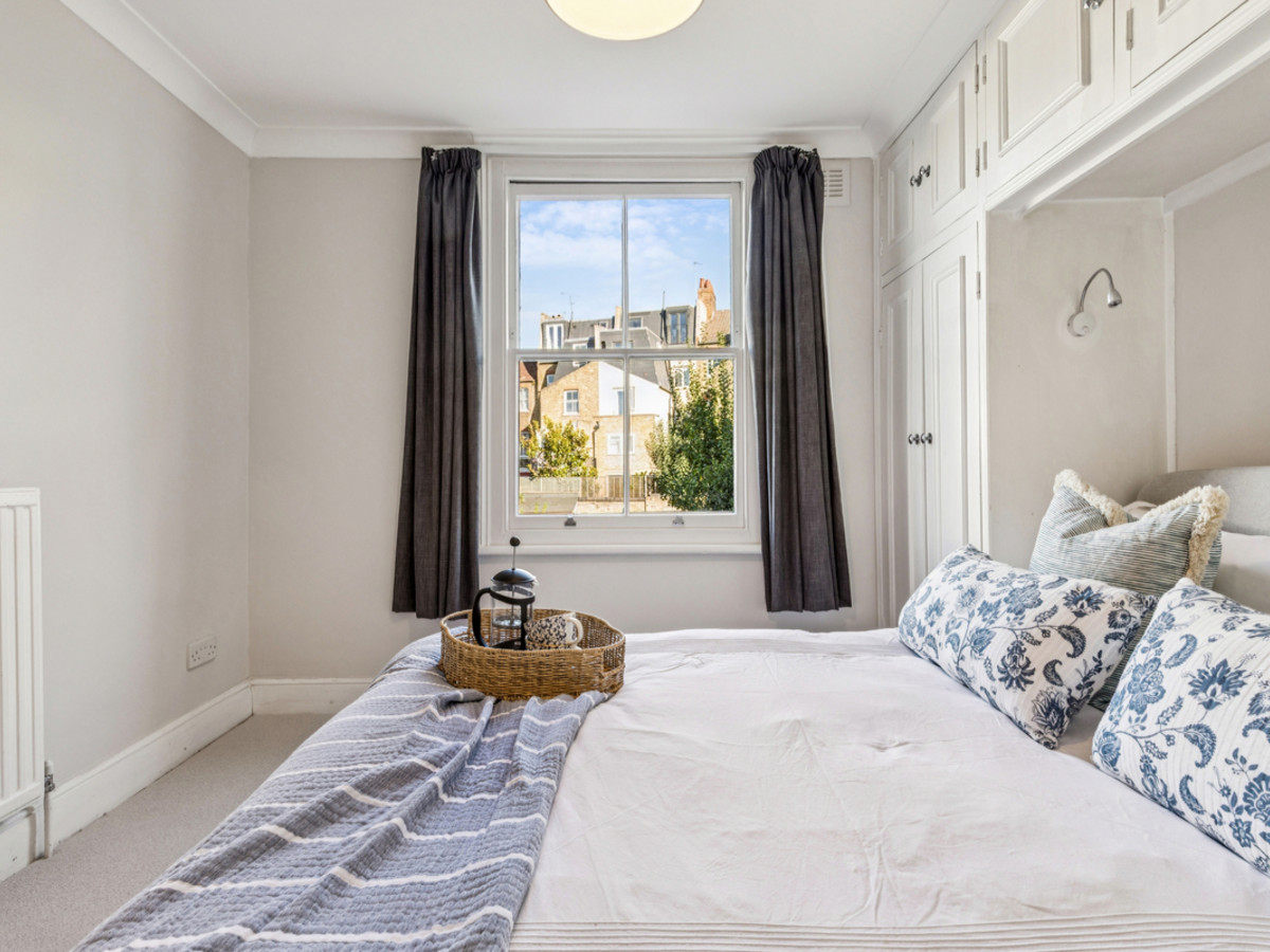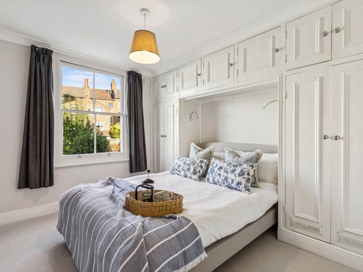 The elegant living room is a true highlight, featuring original cornicing, a beautiful fireplace, high ceilings, bespoke built-in shelving, and a large bay window. Thanks to its raised ground floor position and south-west facing aspect, the room is flooded with natural light throughout the day.