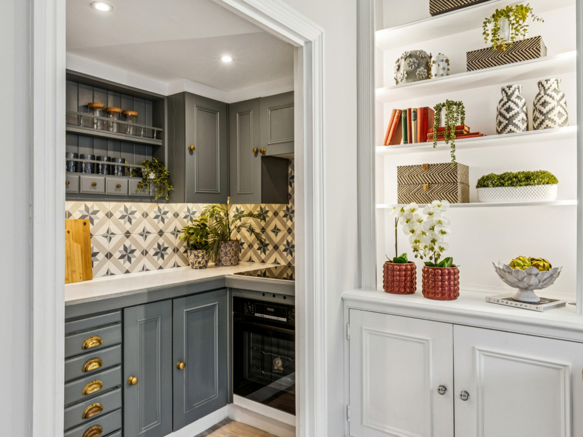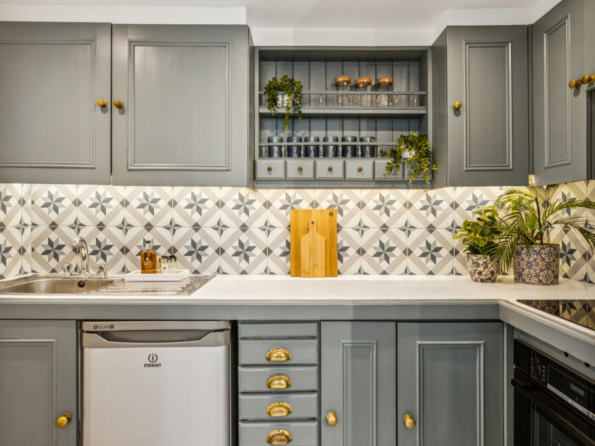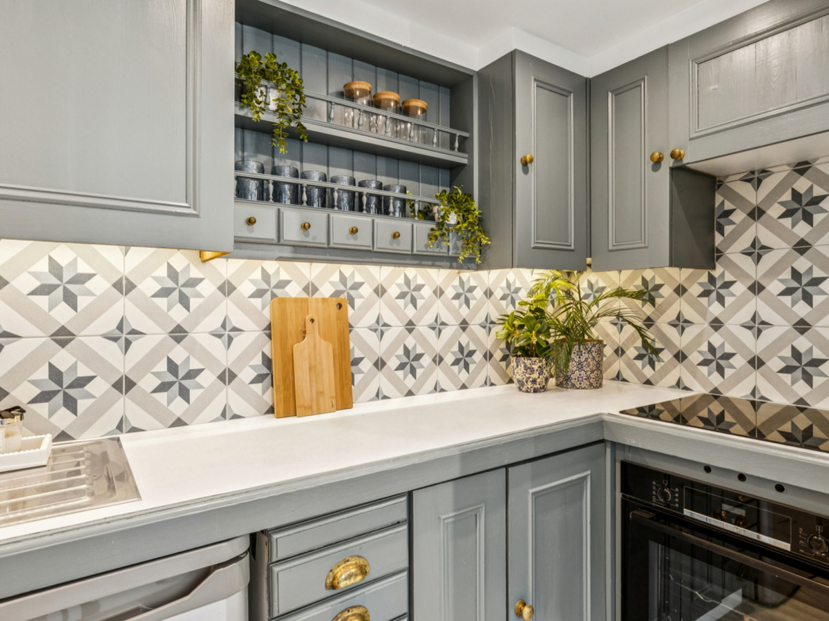 The charming pocket kitchen sits just off the living space and has been decorated with coordinated paintwork and tiling to complement the interiors.