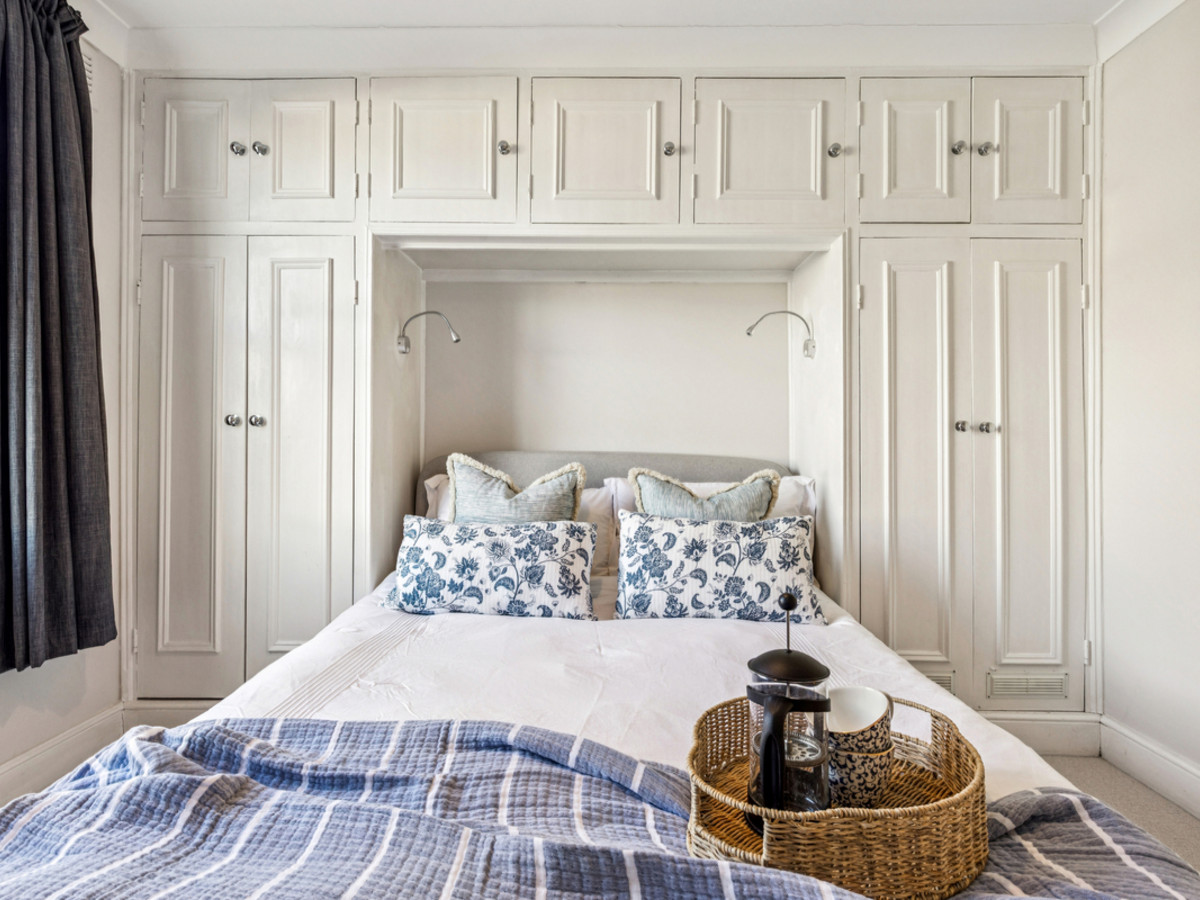 The peaceful master bedroom is situated at the back of the property overlooking the garden and has built in wardrobes around the bed.