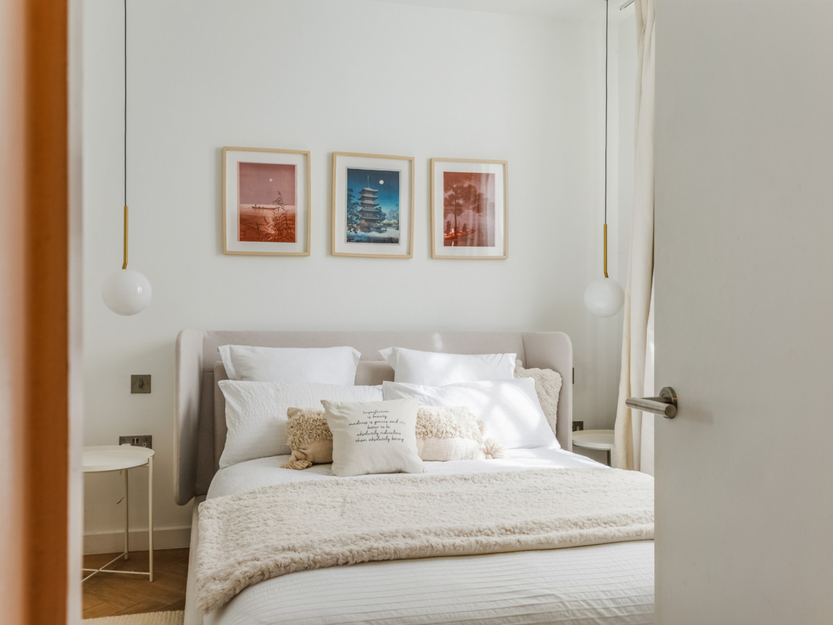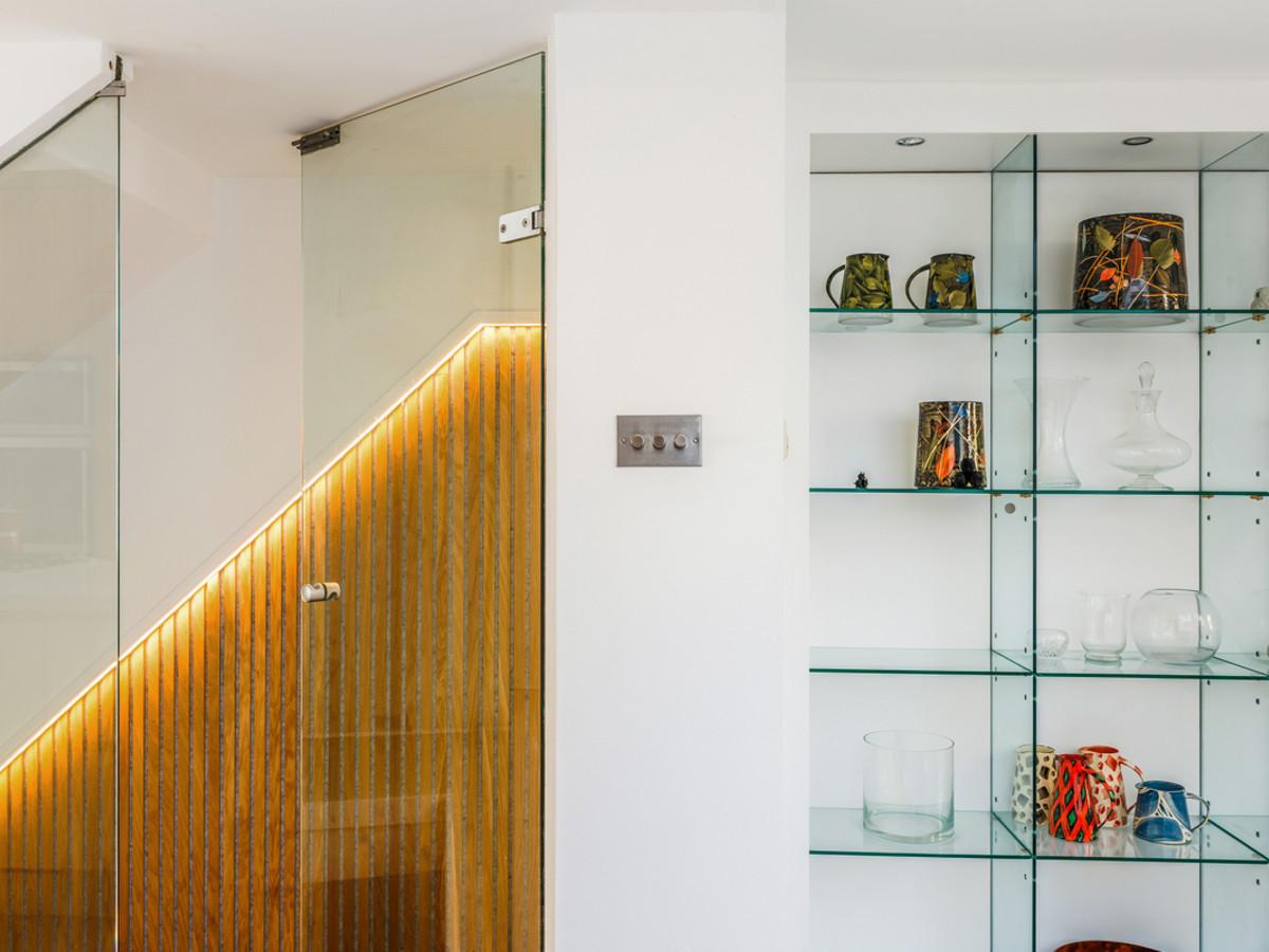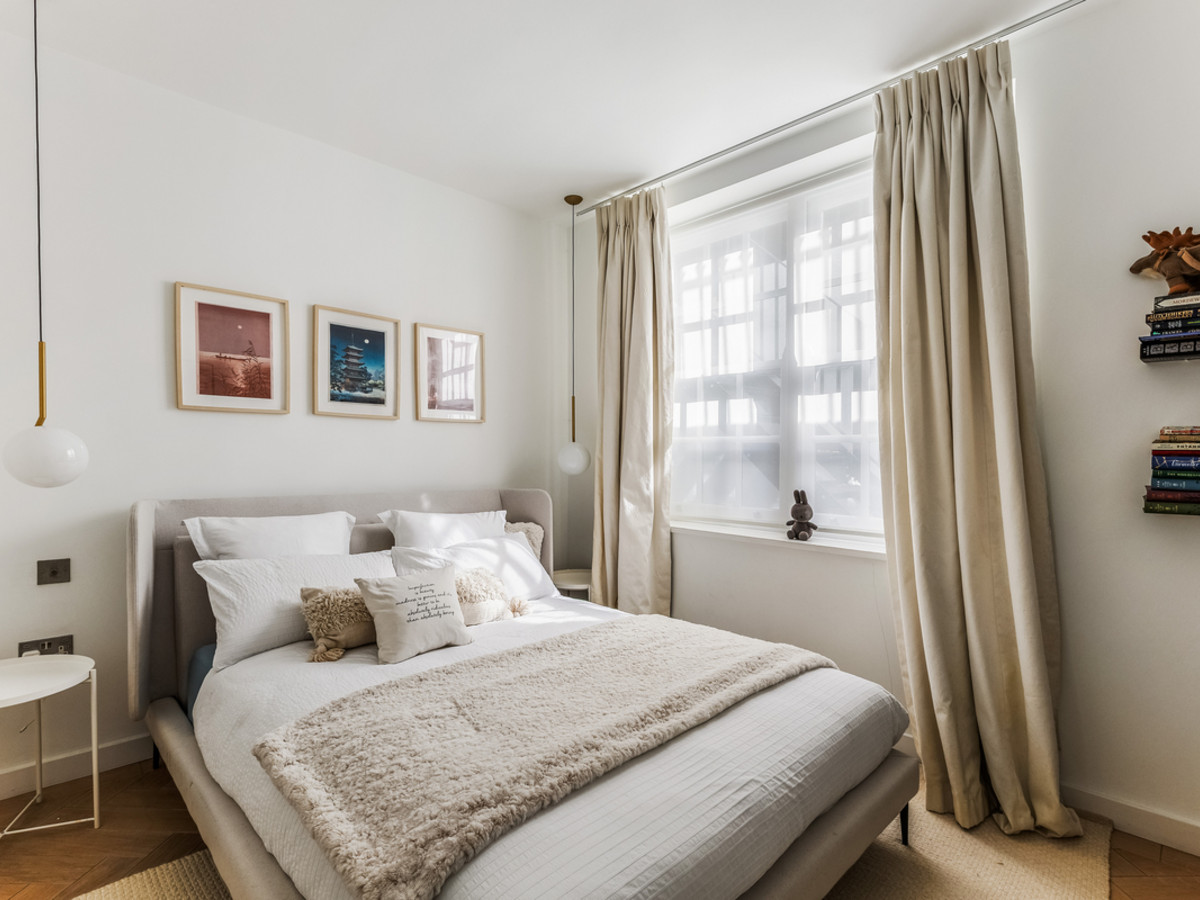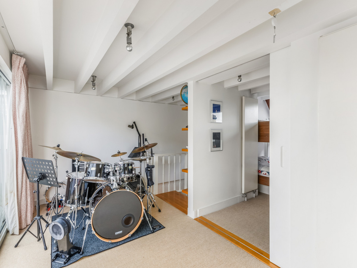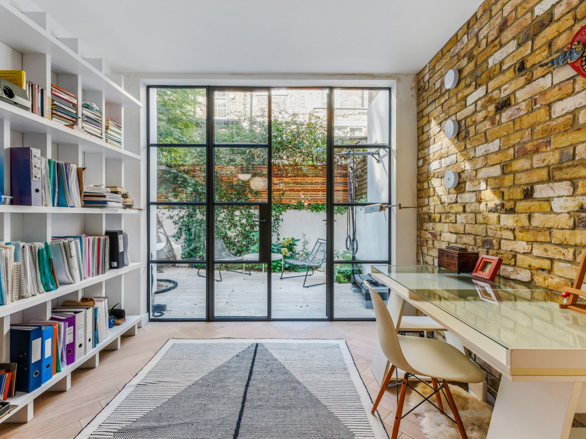 A contemporary glass balustrade with wood panelling leads down to a relaxed living space with a study area opening directly to the garden. This floor also includes two double bedrooms and a stylish bathroom. The main living room showcases solid oak flooring, a working fireplace, original shutters, bespoke floor-to-ceiling shelving, and a statement Moooi light fitting. Bedrooms & Bathrooms: The principal suite occupies the second floor, complete with a bespoke dressing area and luxurious ensuite bathroom featuring Samuel Heath XO fittings. The top floor offers a further bedroom and flexible music/study space, opening onto a private terrace with rooftop views, alongside an additional family bathroom.