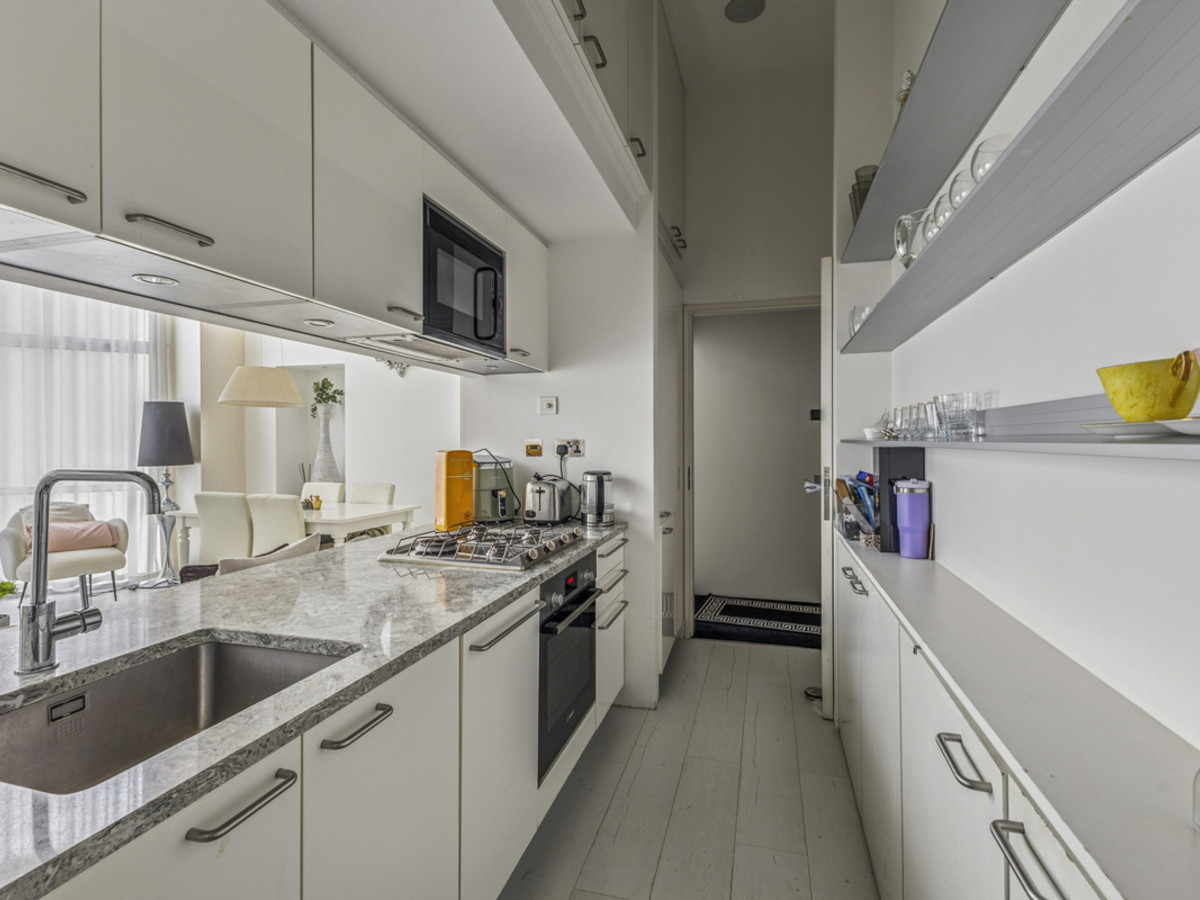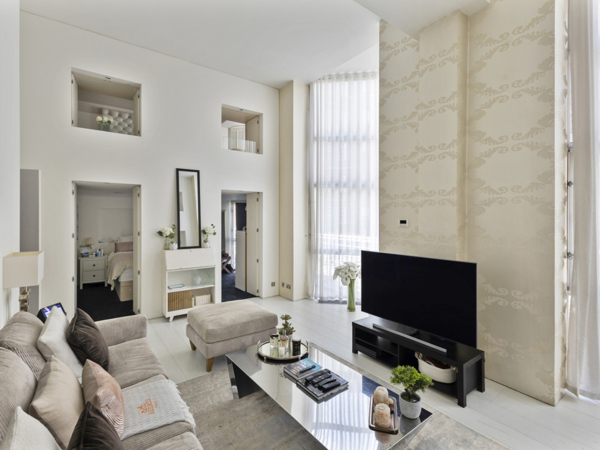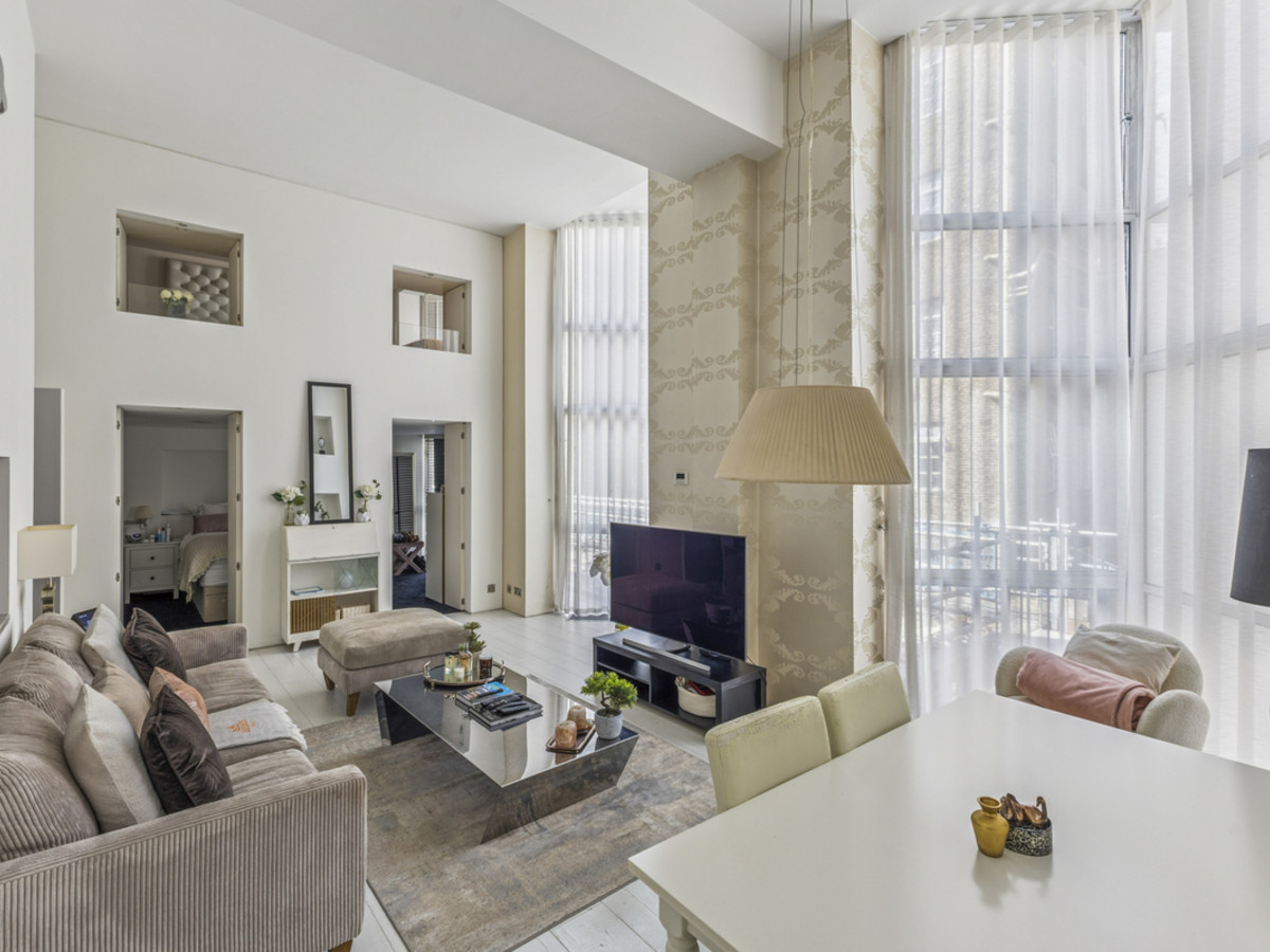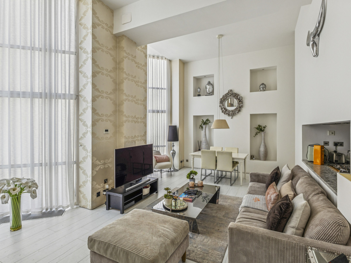 This split-level apartment boasts high ceilings and an abundance of natural light throughout. The spacious layout includes two generous double bedrooms, two modern bathrooms, and an open-plan living area that makes full use of the building’s dramatic architectural features.