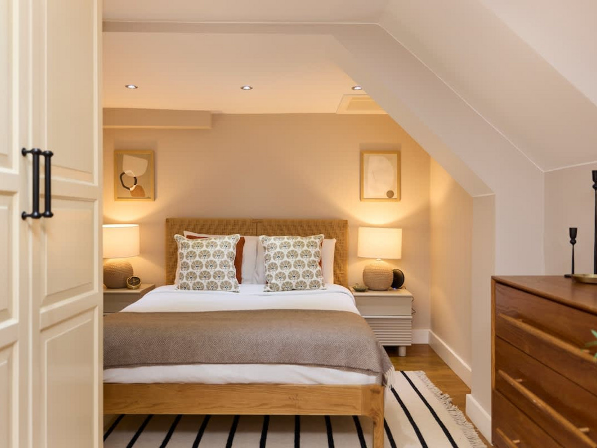 • Bedroom: Located at the rear of the home, furnished with a double bed, built-in wardrobes, and sloped ceilings for added character