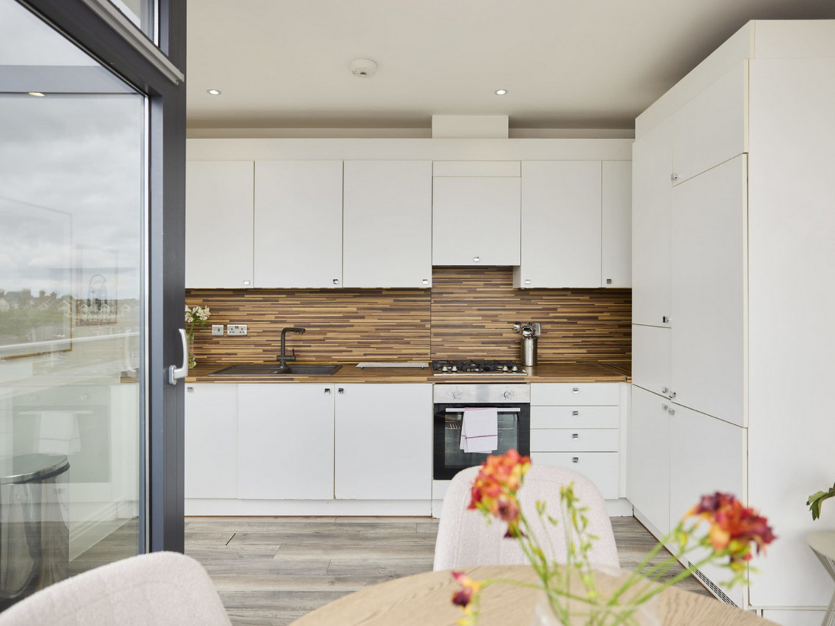 • Modern kitchen with integrated appliances, including gas hobs, dishwasher, and washer-dryer
