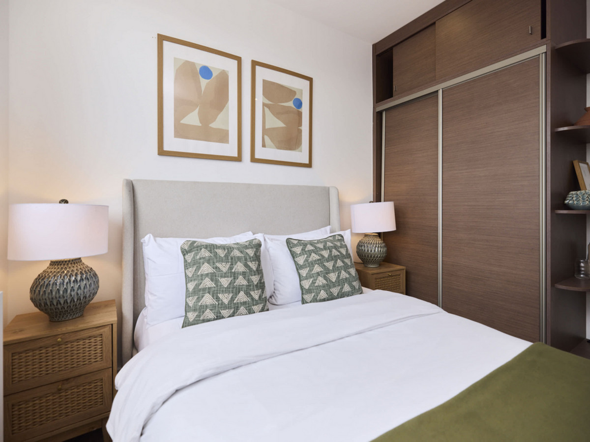 • Two private balconies (one accessible from the living space, one from the kitchen/dining area)
