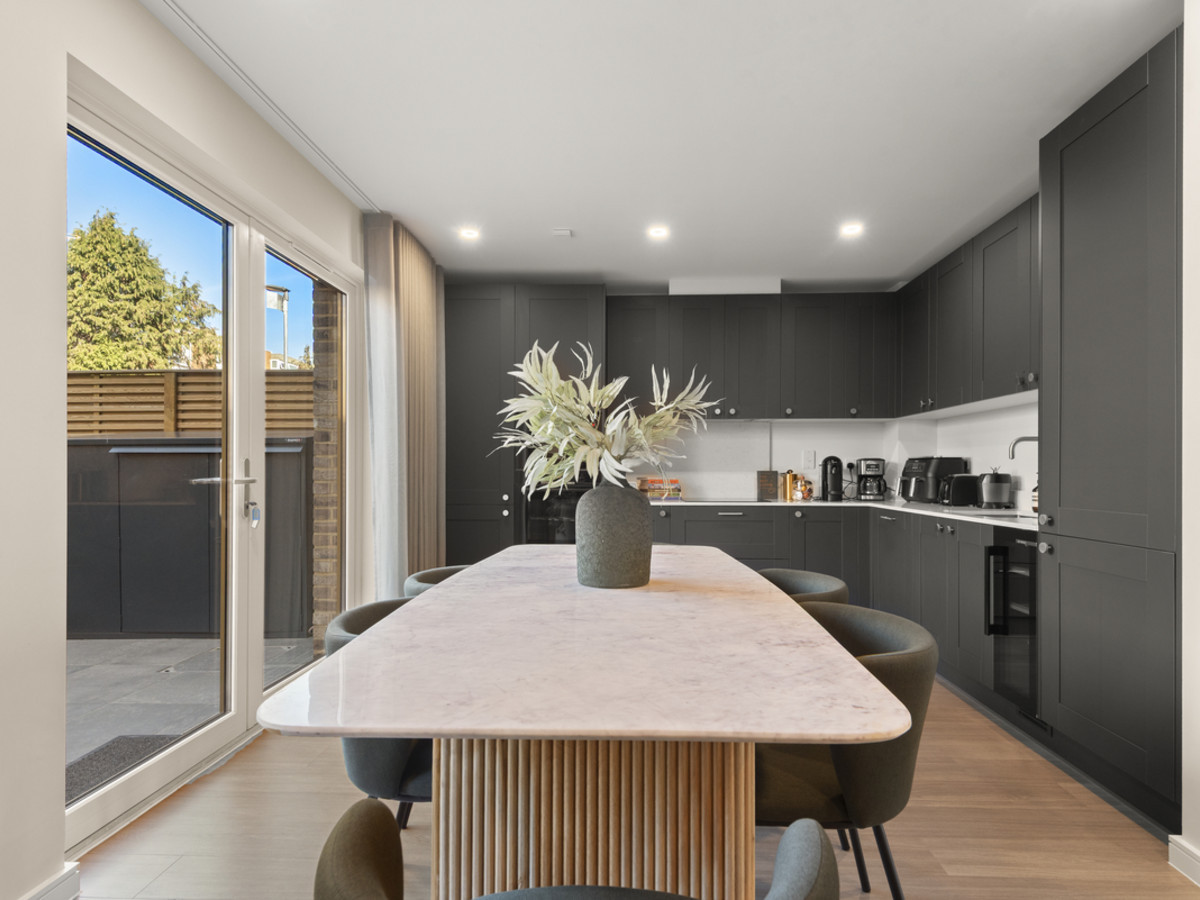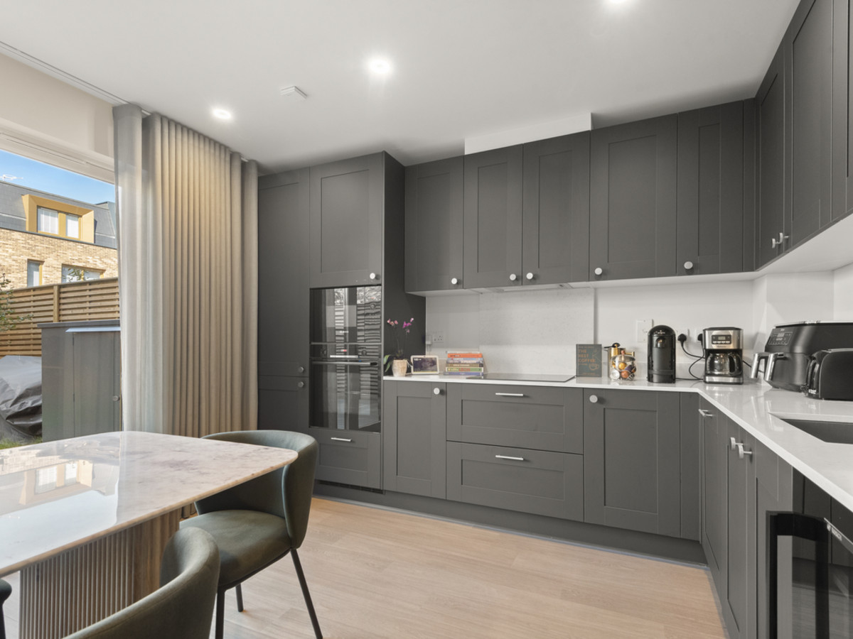 On the ground floor, you’ll find a modern open-plan kitchen and dining area, featuring sleek cabinetry and integrated appliances. Full-width bi-fold doors open seamlessly onto the private garden, creating the perfect indoor-outdoor entertaining space. A separate study, utility room, and guest WC complete this level, making it as practical as it is elegant.