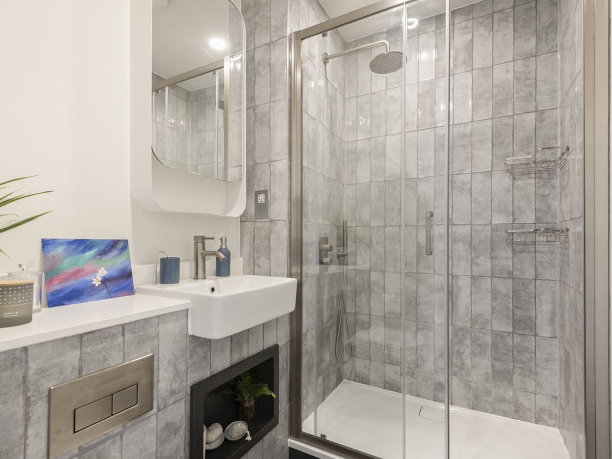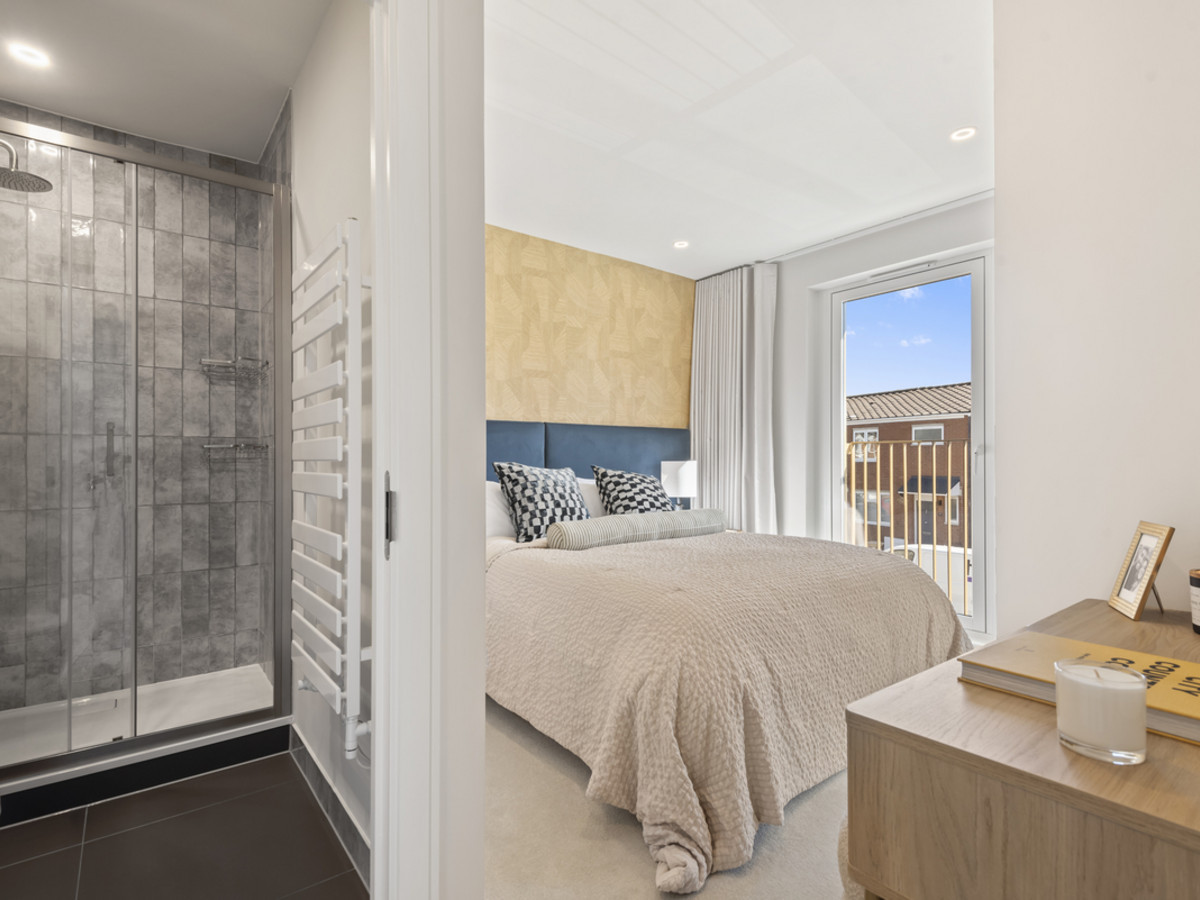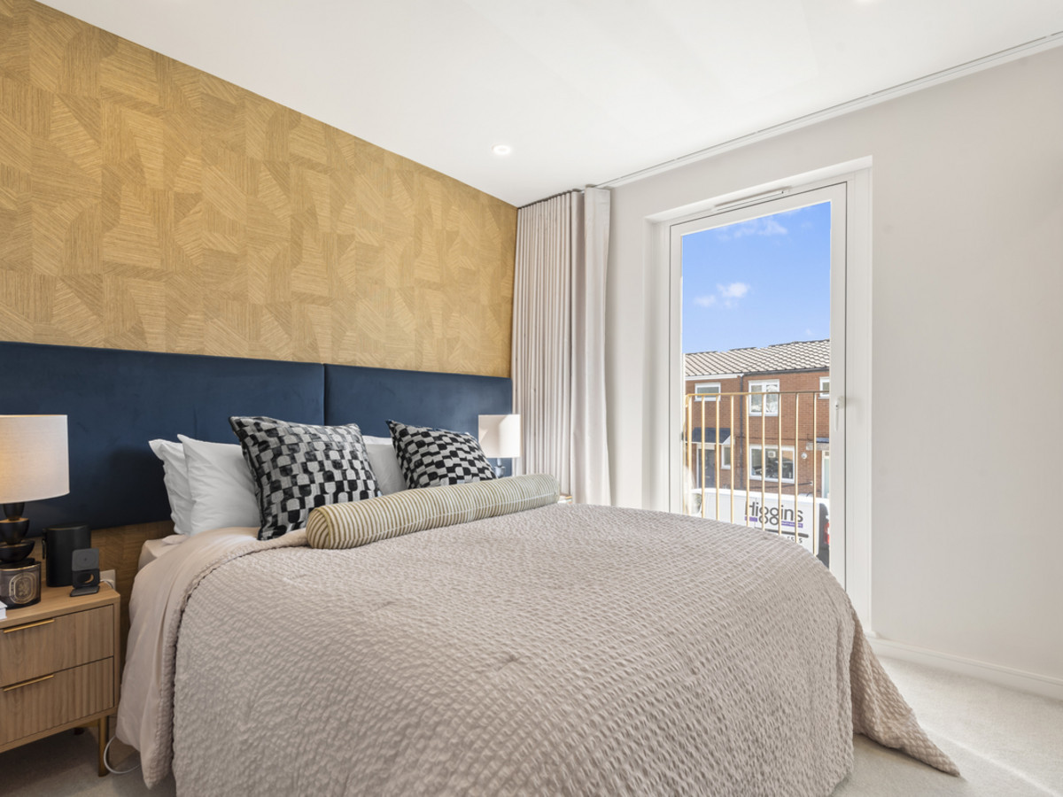 The first floor boasts a generous reception room with a Juliette balcony, flooding the space with natural light — ideal for both family living and entertaining. The principal bedroom suite occupies the remainder of this floor, complete with built-in storage and a stylish en-suite shower room.