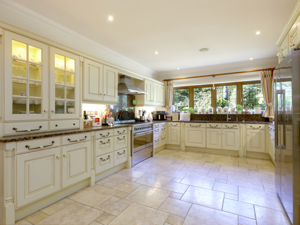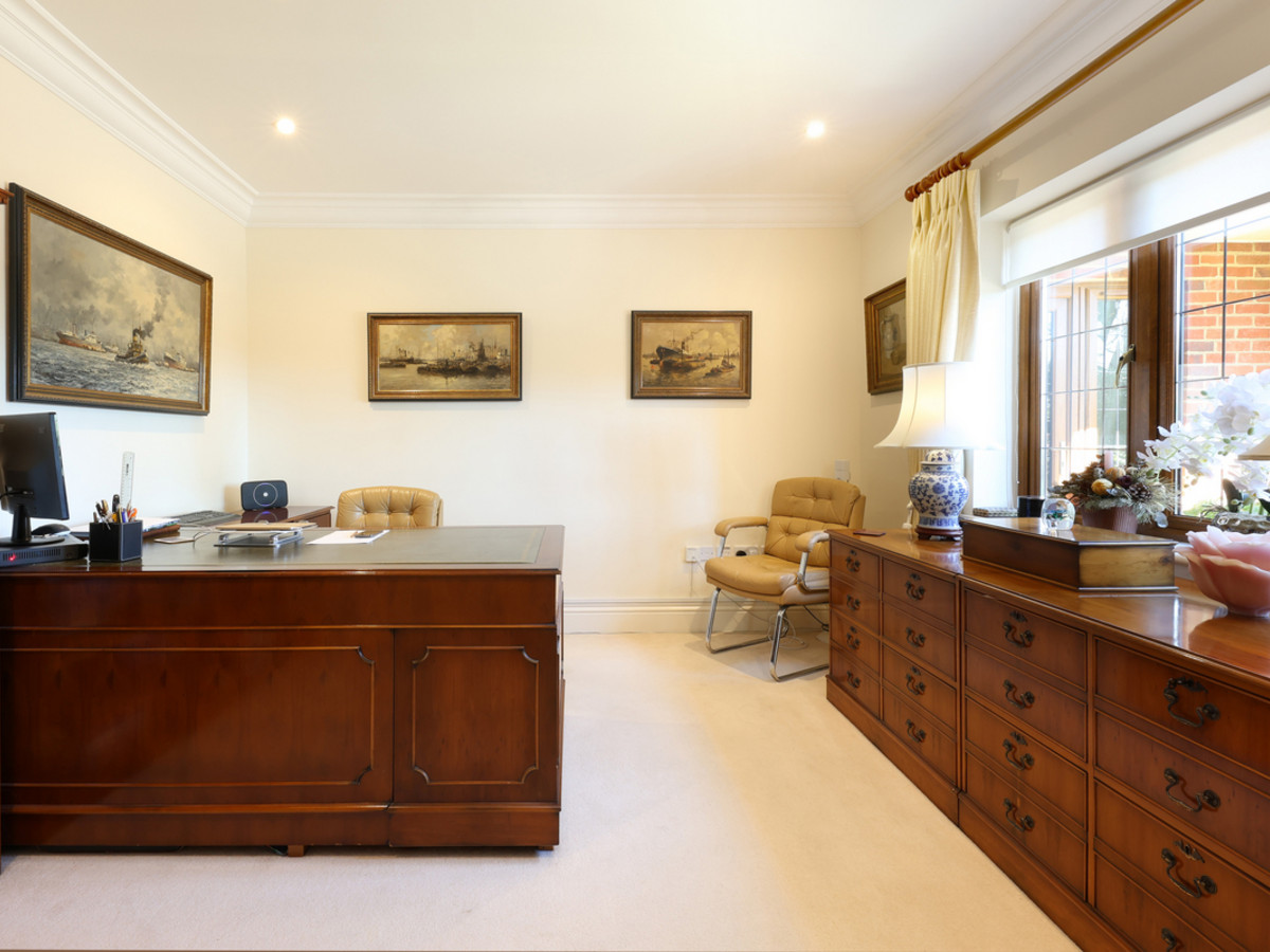 At the heart of the home lies a spacious kitchen and breakfast room, fitted with cream cabinetry, sleek dark granite worktops, and high-end appliances. French doors open directly onto the garden, enhancing the indoor-outdoor connection. A cosy family room and a dedicated study provide further versatile living and working spaces.