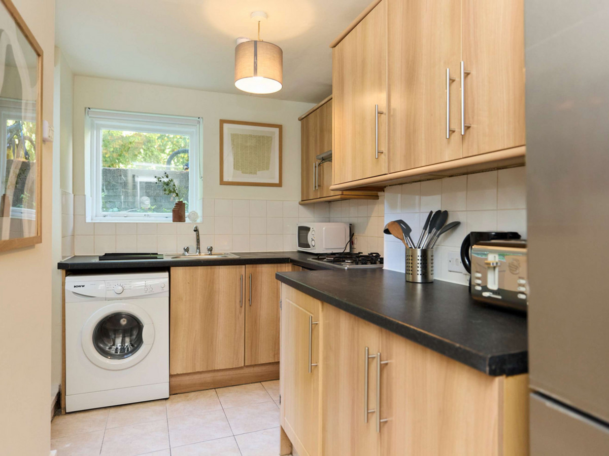 • Kitchen: A galley-style kitchen with wood cabinetry, oven, hob, washing machine and essential appliances.