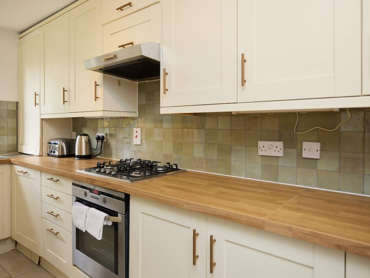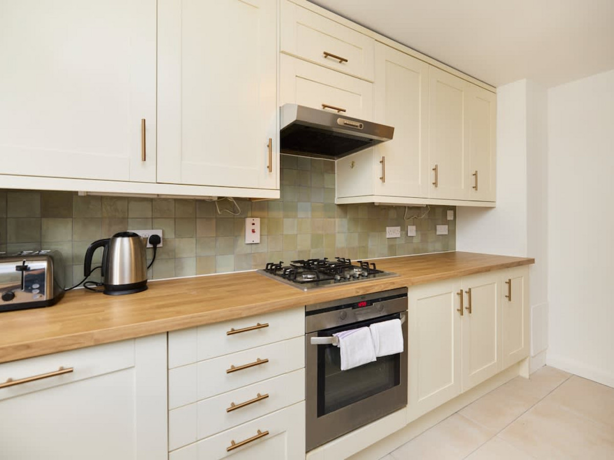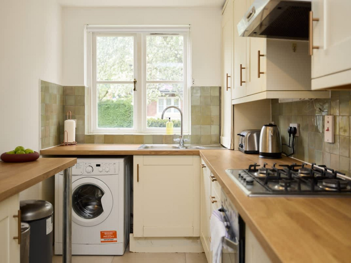 A separate galley-style kitchen fitted with standard appliances including an oven, gas hob, microwave, washing machine, and under-counter fridge with freezer compartment.