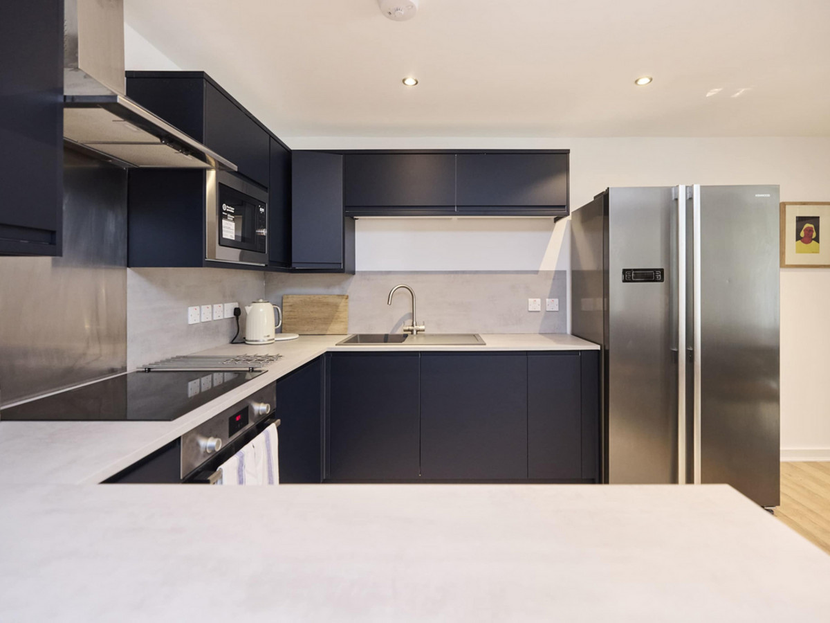 • Fully equipped kitchen with electric hobs, dishwasher, fridge/freezer, oven, microwave, and washer-dryer