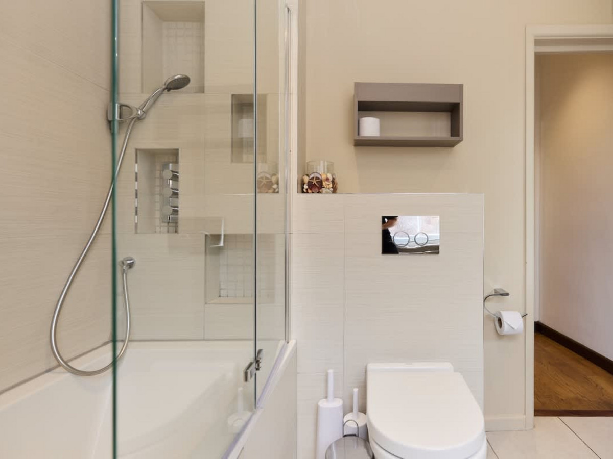 • Two contemporary bathrooms, one with a walk-in shower and the other with a combination shower over bath