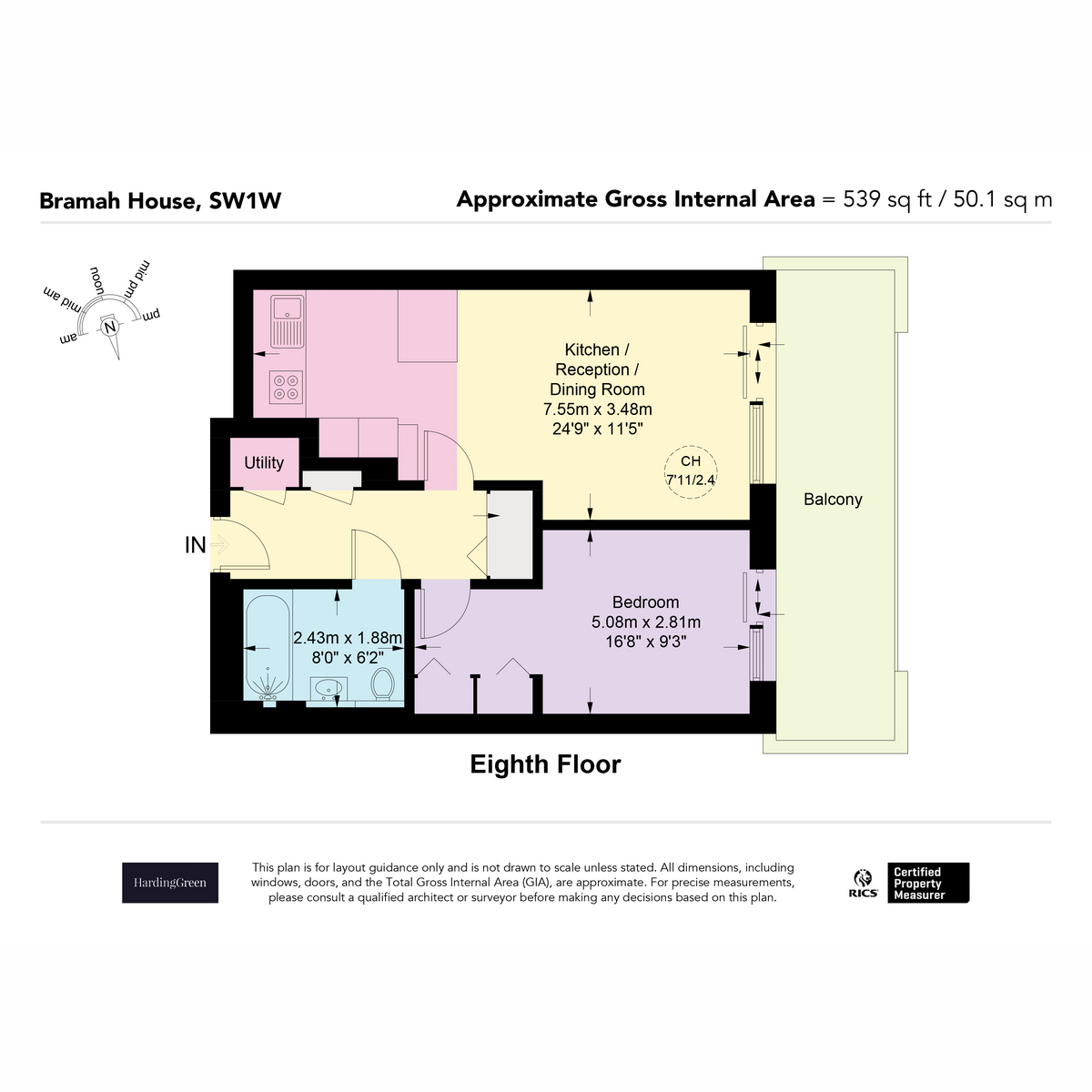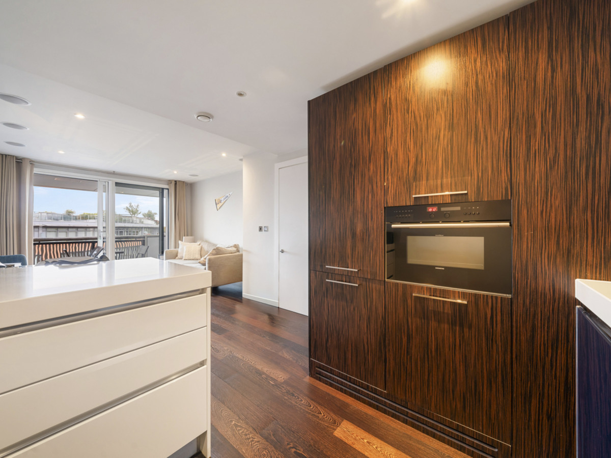 This modern one-bedroom apartment offers approximately 539 sq ft (50.1 sq m) of internal living space and is positioned on the eighth floor of Bramah House, part of the sought-after Grosvenor Waterside development in Chelsea.