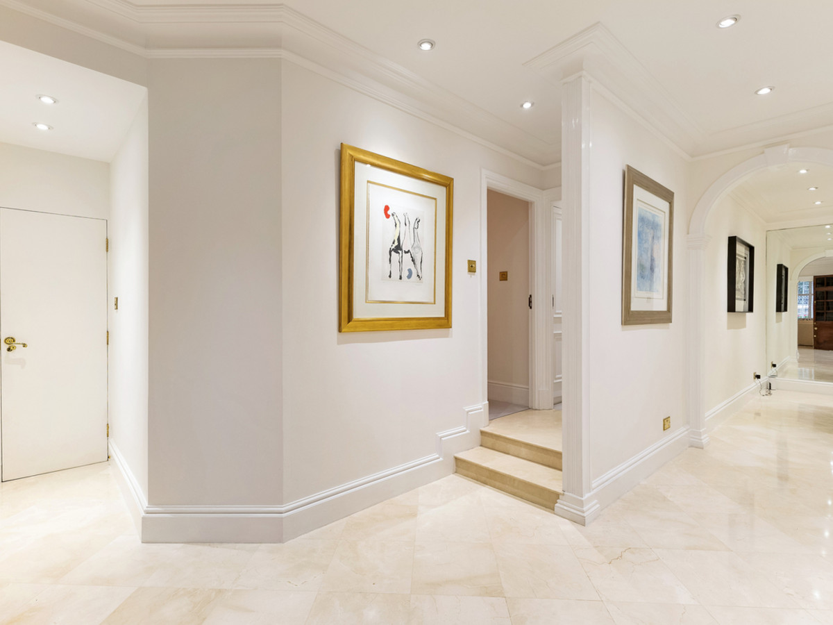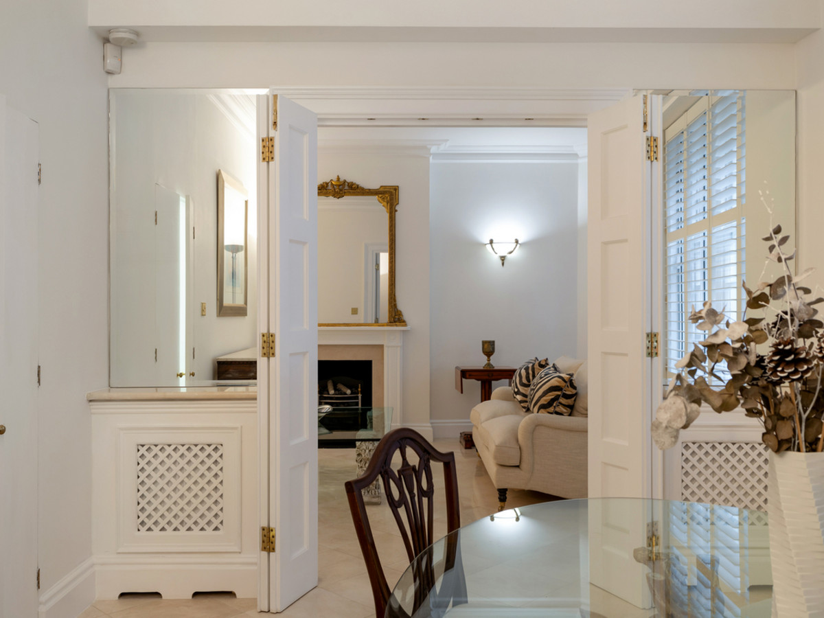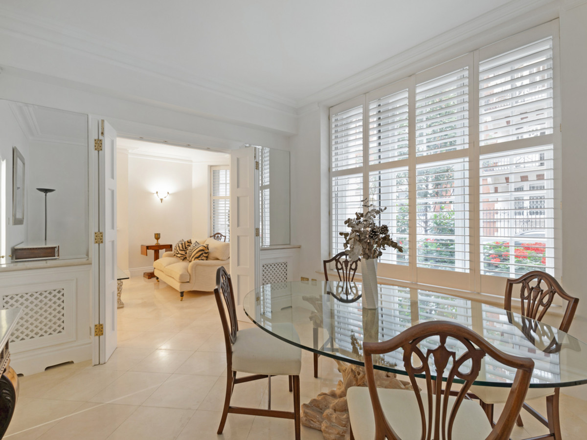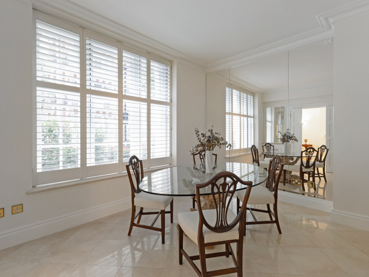 The apartment opens into a grand entrance hall, leading to a spacious main reception room and a separate formal dining room, ideal for entertaining. A well-appointed kitchen sits to the front of the property.