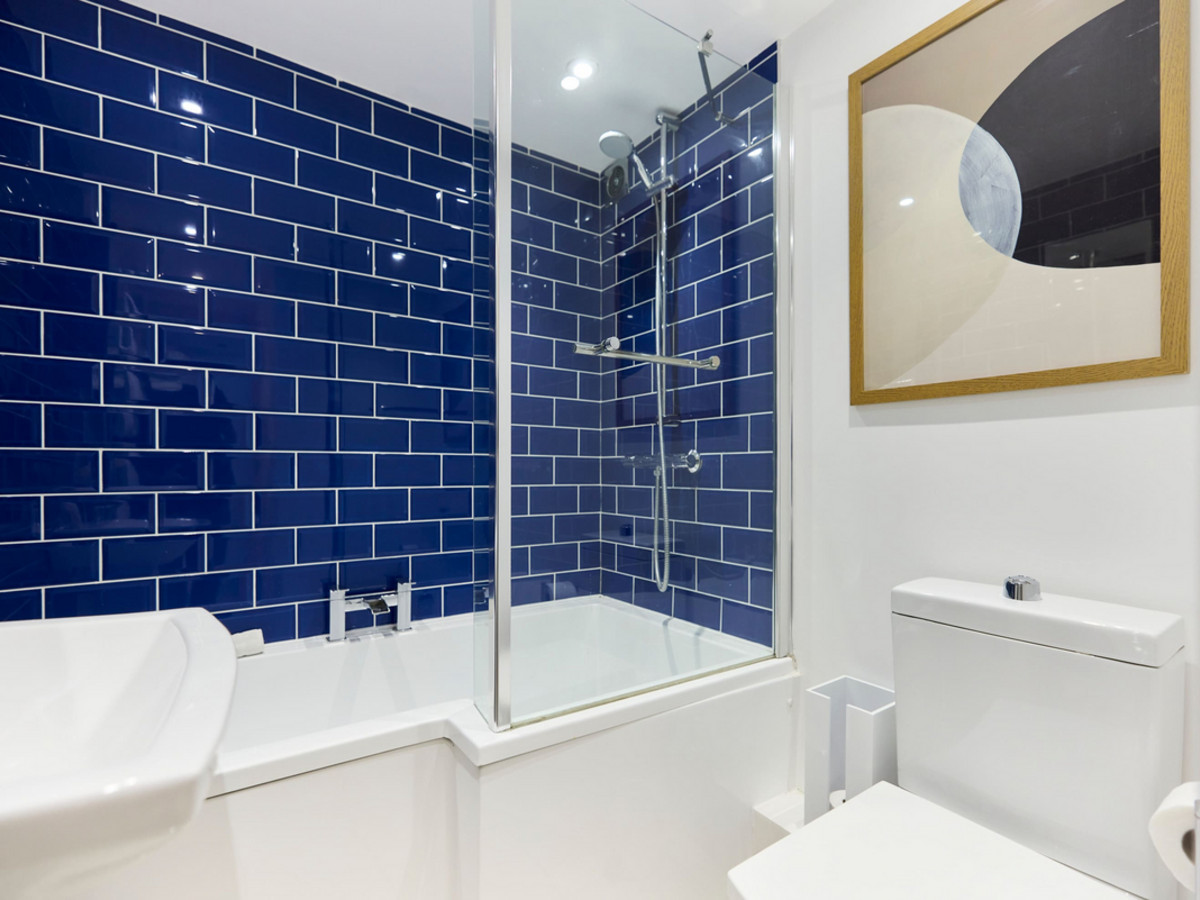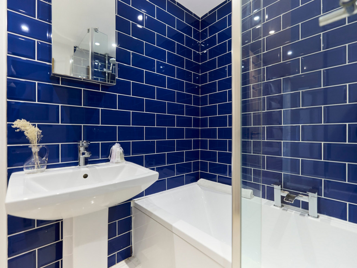 Stylishly tiled in navy blue, this bathroom includes a combination bathtub and rainfall shower, sink, mirror cabinet and heated towel rail.