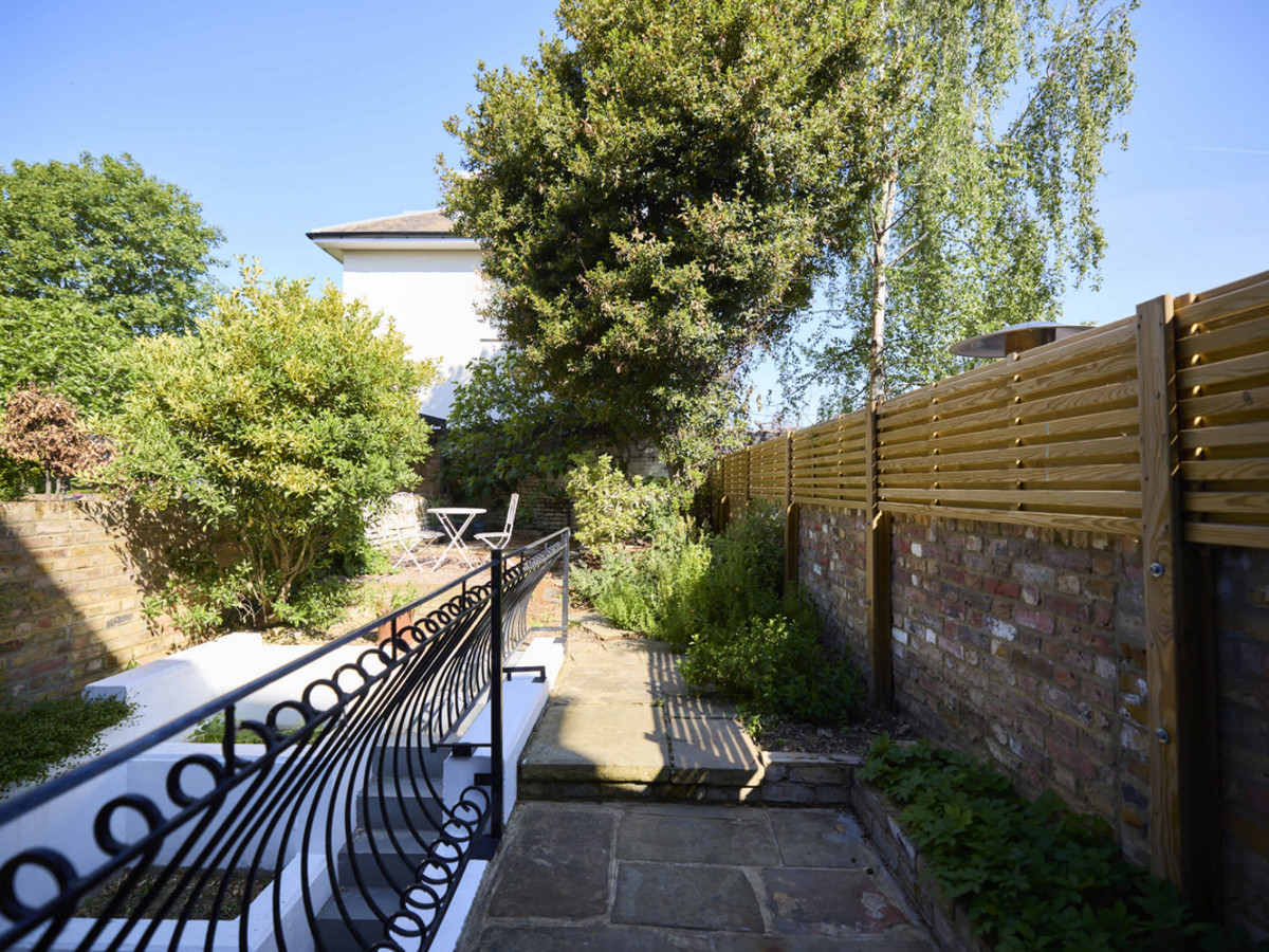 The upper-level terrace is furnished for outdoor dining and leads via stairs to a private garden, featuring mature planting and a fig tree.