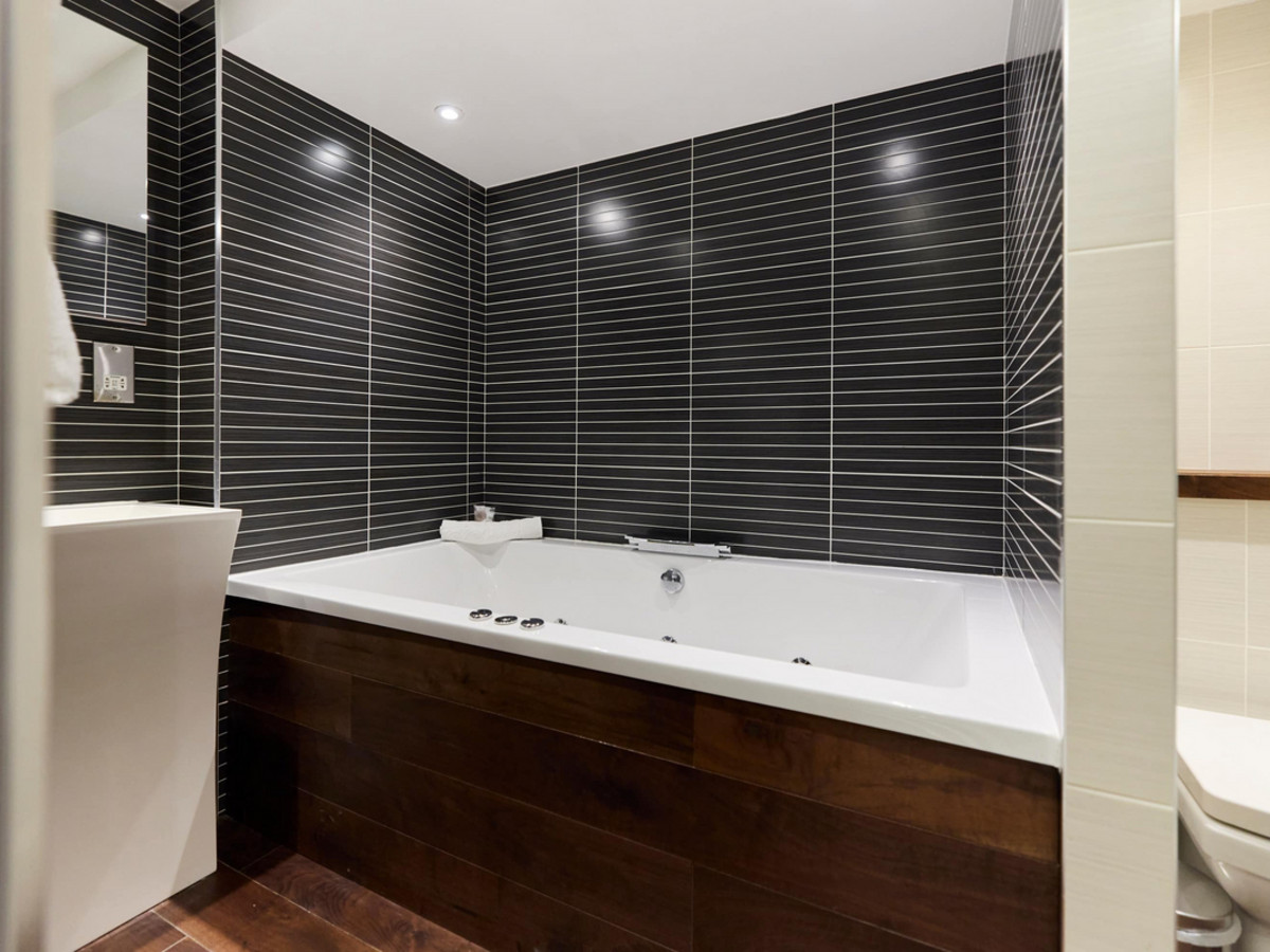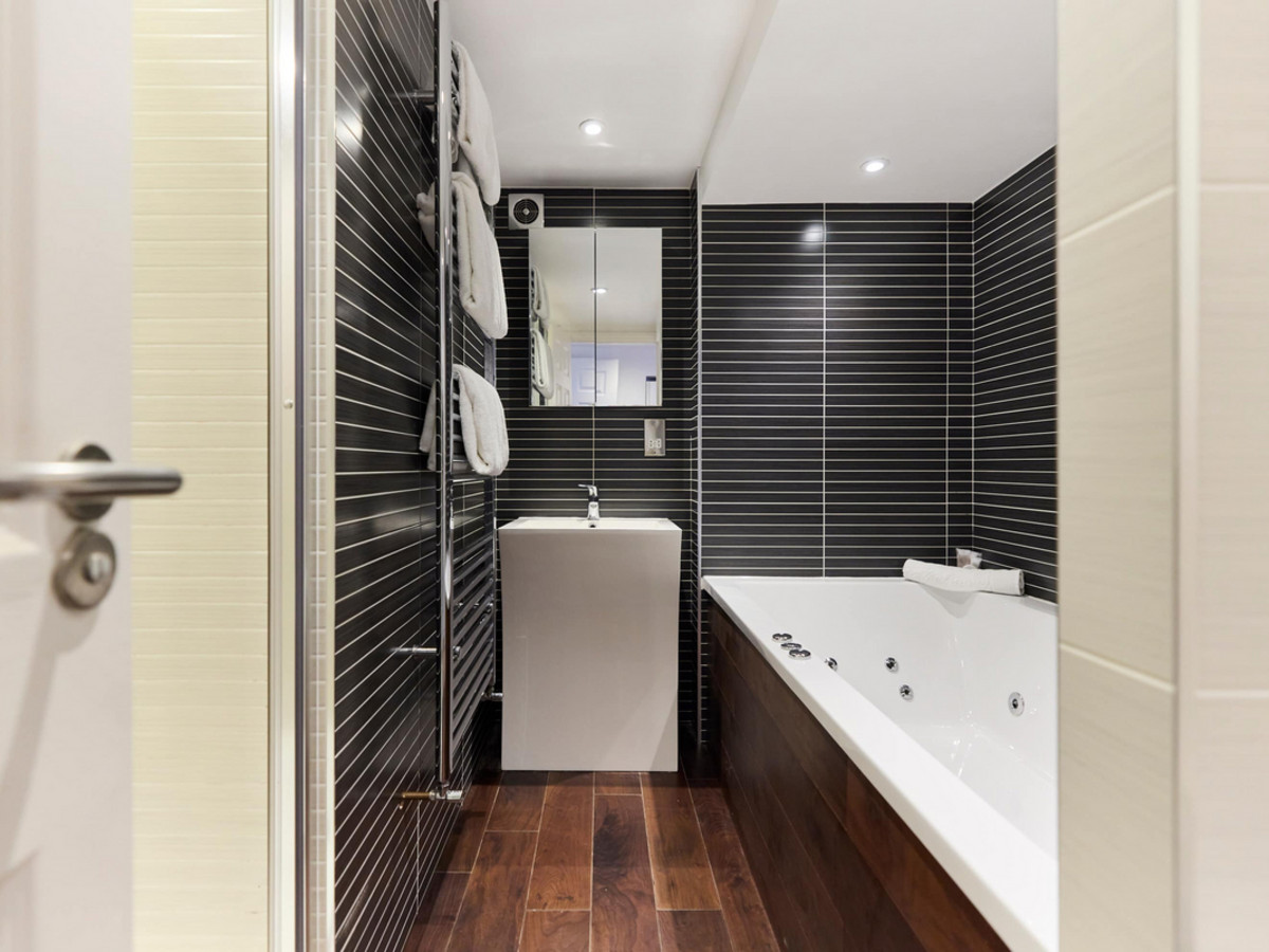 Features a large jetted bathtub, separate rainfall shower, vanity unit and mirror. The WC is located in its own enclosed section for privacy.
