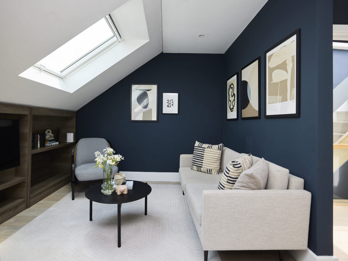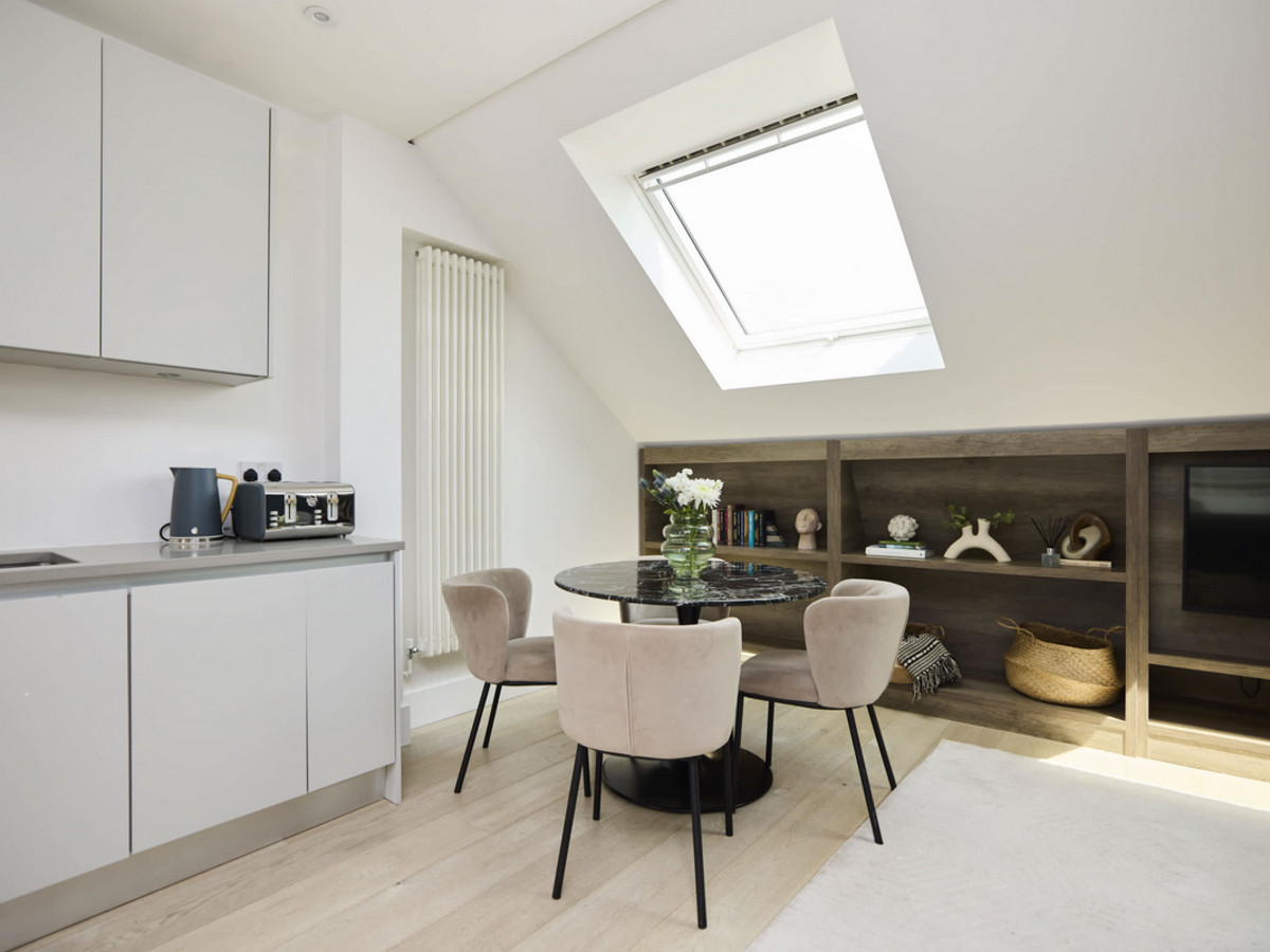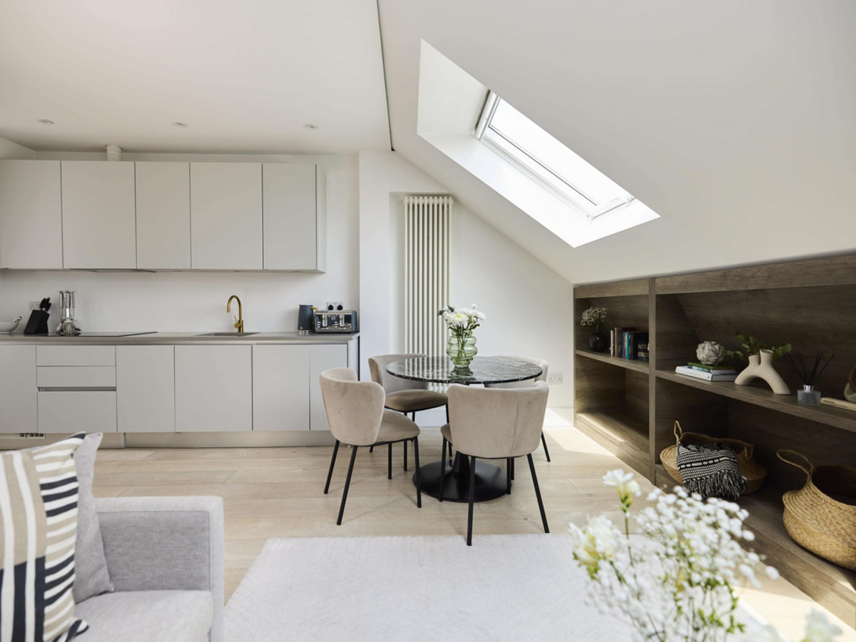 A bright and contemporary one-bedroom flat with skylights, open-plan living space, modern bathroom, and private balcony—all on one level in vibrant Battersea.
