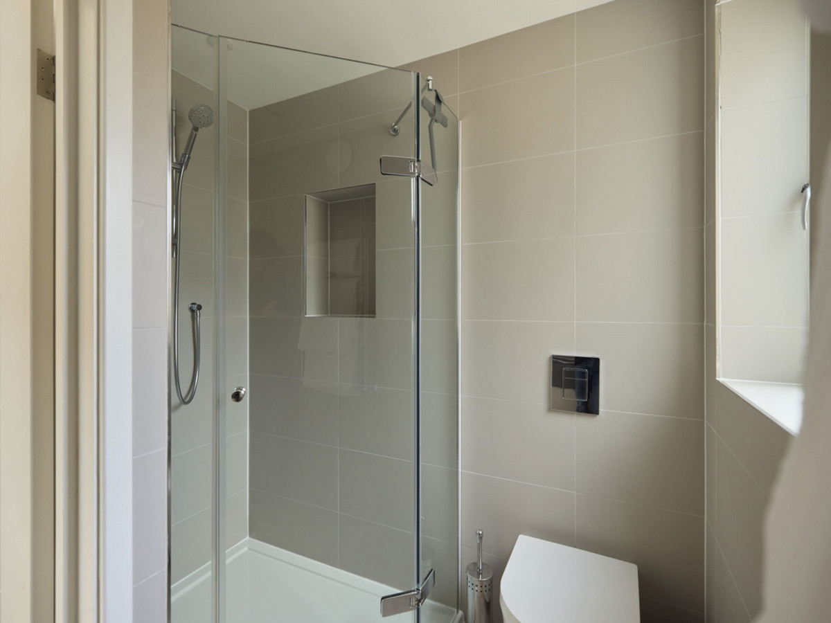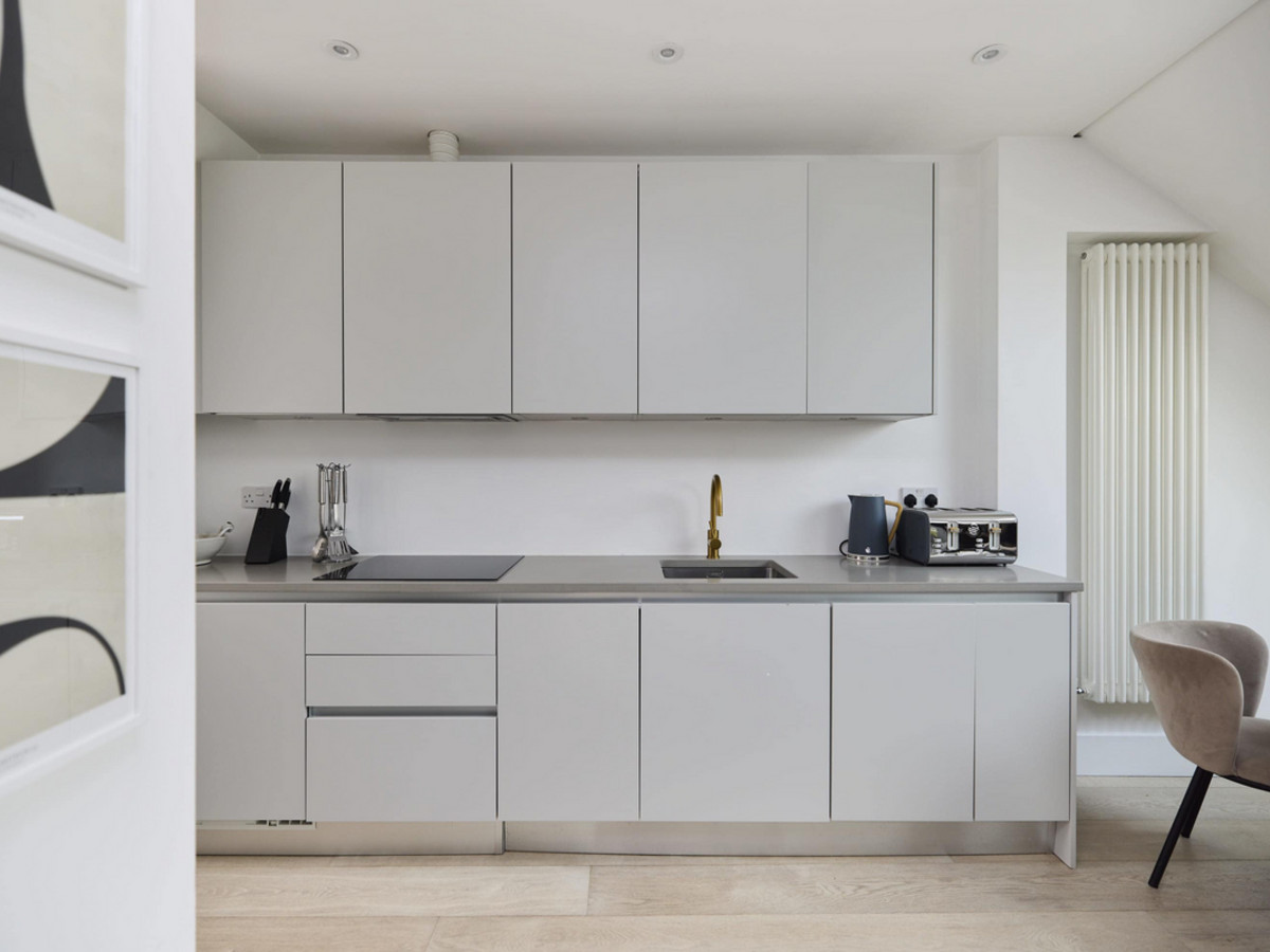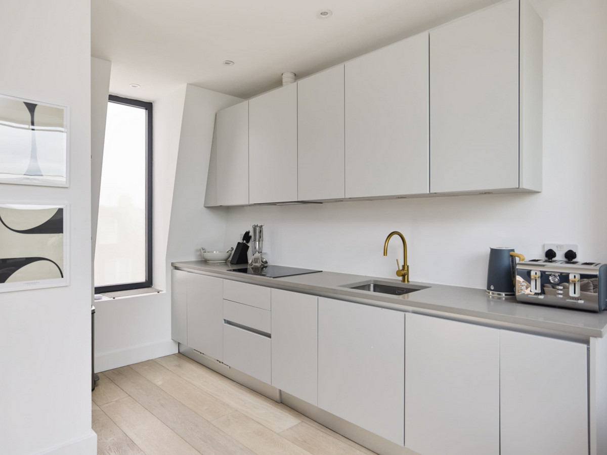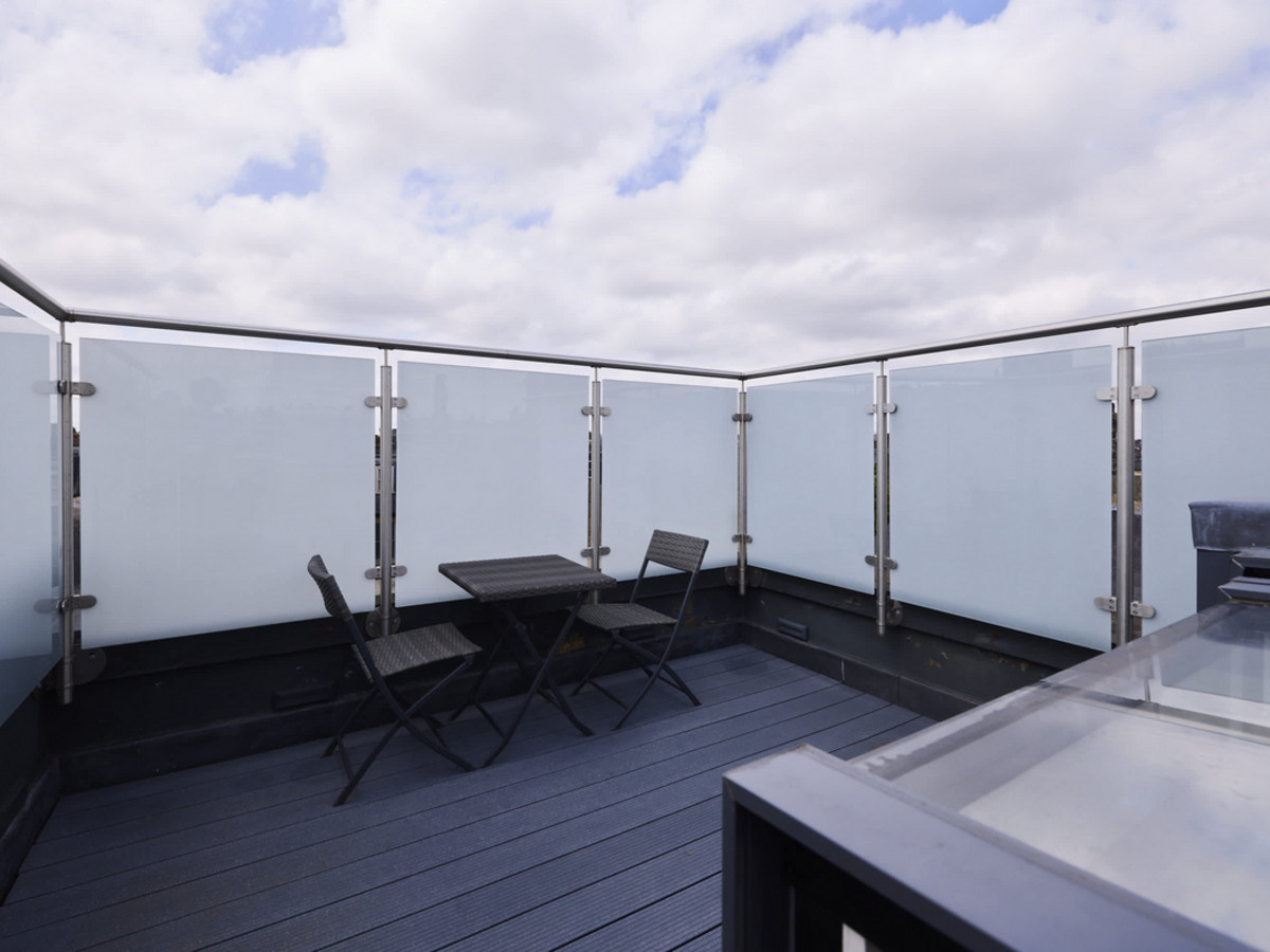 A bright and contemporary one-bedroom flat with skylights, open-plan living space, modern bathroom, and private balcony—all on one level in vibrant Battersea.