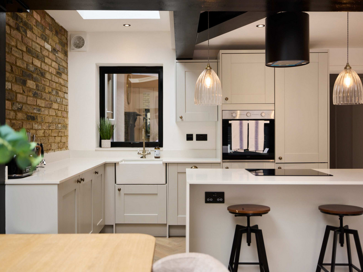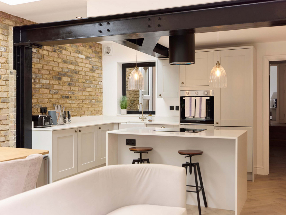• Contemporary kitchen with induction hob, integrated appliances, and breakfast bar seating